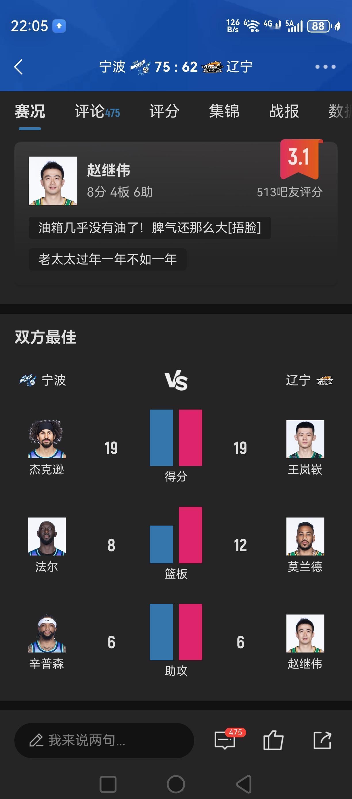 辽宁全场62分!输给宁波队![捂脸][捂脸][捂脸][捂脸] 感觉,除了王岚嵚,一个能打的都没有! 赵继伟伤愈复出,但状态太差了。攻,防,组织,啥也没有! 今年宁波队挺有气势的。鲁吐布拉打得挺好的!抢篮板,防守,挡拆!不遗余力!好蓝领球员![赞][赞][赞][赞]