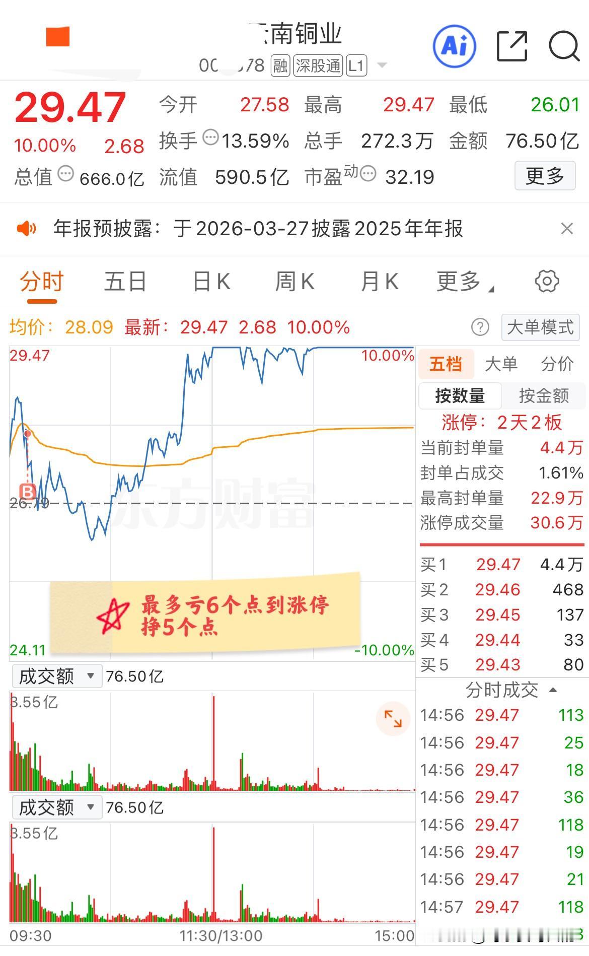 云南铜业,今天最大的安慰!不过盘中也一度受到了惊吓[捂脸]! 今天早上云铜高开3%,可惜开盘的时候犹豫了一下没有追。没想到开盘后一波拉升直接冲到差不多7个点。 就在拍大腿的时候,没想到股价又回落了,等到跌到4个点的时候终于决定买进去了。可谁曾想买进去就是高点,然后就一路跳水翻绿。 本以为我这一波买铜直接干崩了金属牛市,但是随着10点半COMEX铜开始暴力拉升,云铜也迅速翻红并在午间收盘前冲上9个多点,下午开盘后就直接封上了涨停。虽然后面多次开板,好在最后成功封板! 今天确实是有点刺激了,从买进后一度最多亏6个多点然后又到涨停挣5个点!可惜的是重仓全在半导体和商业航天,追涨云铜这波也只能算是个心理安慰吧[捂脸]!