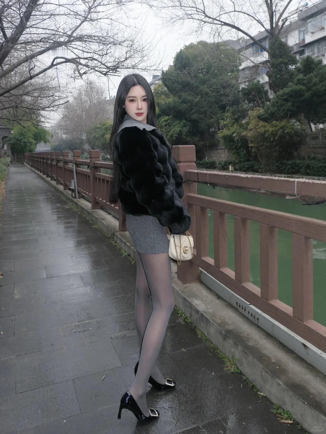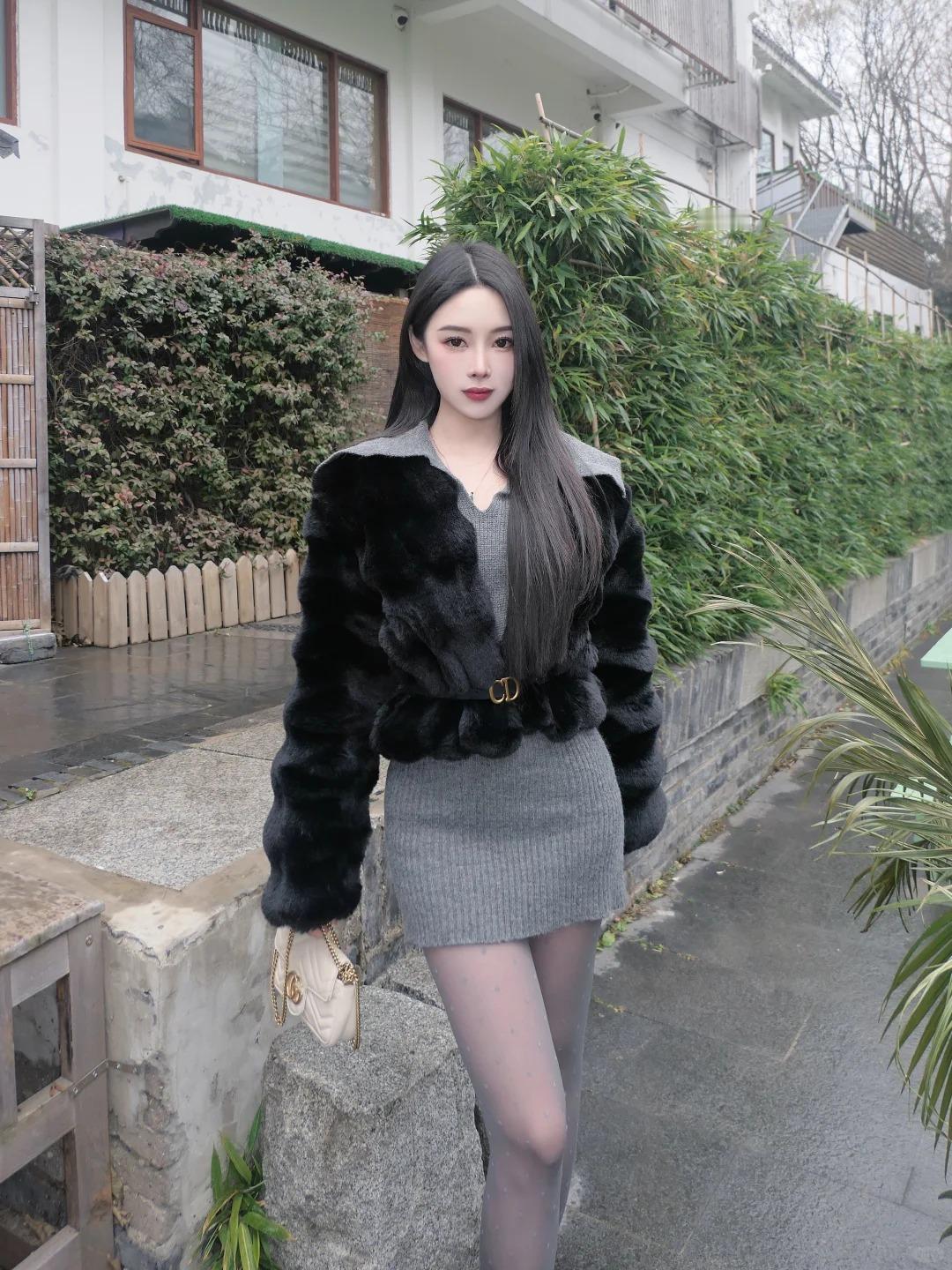 黑灰叠穿自带低调高级感,妥妥的清冷女友风。柔软蓬松的黑色皮草外套,既能抵御寒意,又能营造慵懒随性的氛围,自带贵气滤镜。内搭一件修身灰色毛衣,贴合身形尽显温柔线条,作为基础款完美承托外层造型。下装搭配灰色波点袜,细碎波点为简约色系注入灵动细节,不浮夸却足够吸睛。脚下踩一双精致方扣鞋,利落版型平衡皮草的蓬松感,勾勒出纤细脚踝线条。整套造型无多余色彩堆砌,仅靠黑灰层次碰撞,就穿出了简约不简单的时髦感,日常通勤或约会都适配。