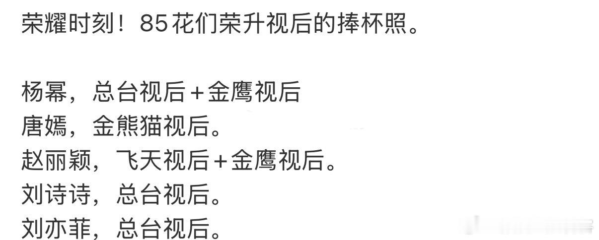 这是谁又来滥竽充数了啊真的不尴尬吗85花们的视后荣耀时刻赵丽颖金鹰,飞天杨幂金鹰,总台唐嫣 金熊猫刘亦菲 总台刘诗诗,总台??杨幂总台视后