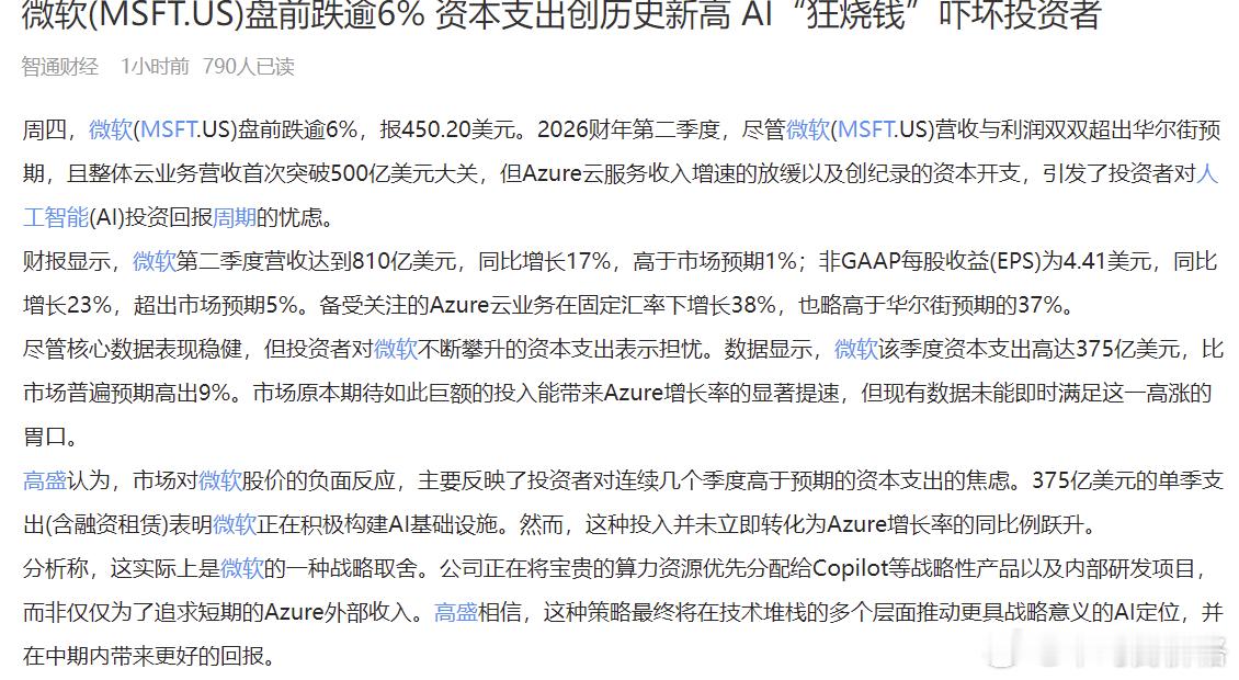 微软跌超10%,2020年以来最大盘中跌幅。连续几个季度超预期的资本支出让市场很慌啊。