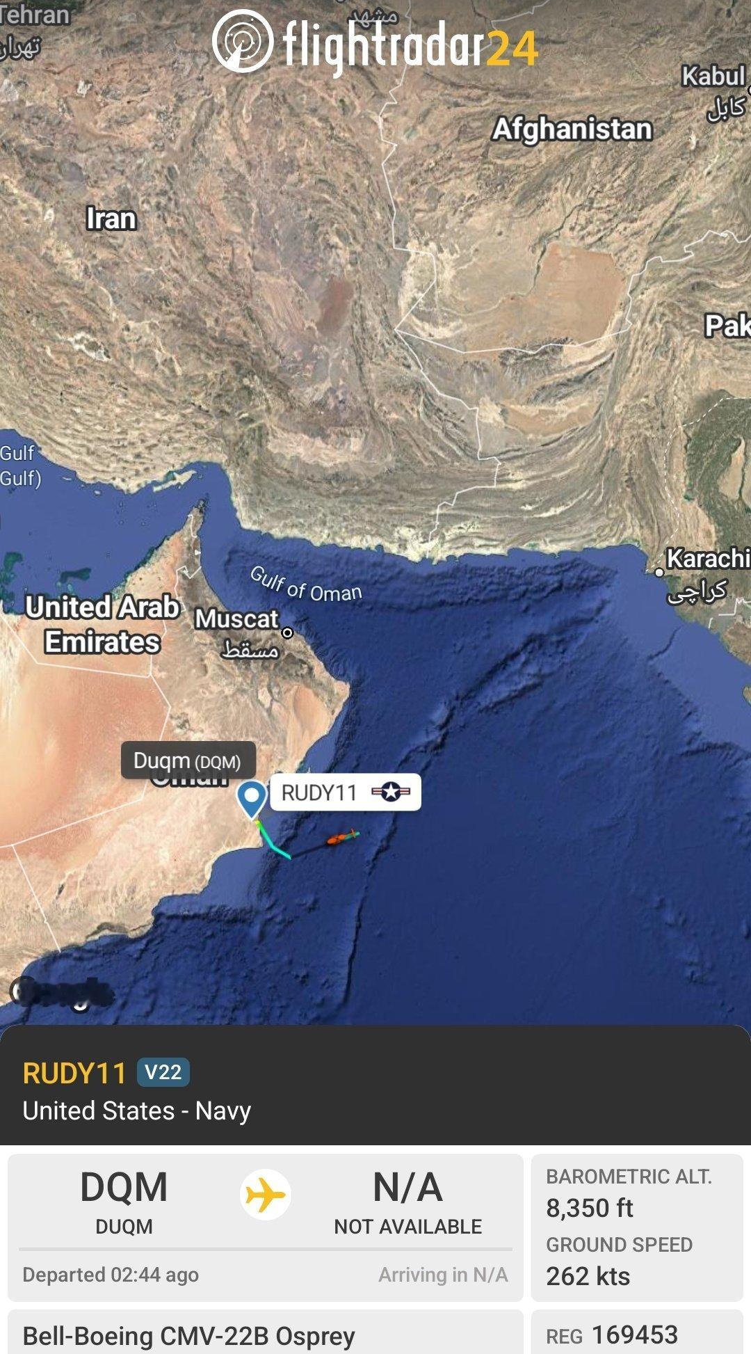🔻美国"亚伯拉罕·林肯"号航母仍在阿曼群山后待命,仿佛害怕过分靠近伊朗...🔻CMV-22B"鱼鹰"运输机注册号 169453 撤离杜库姆。🔻这证实了伊朗无人机昨天曾飞越该区域。🔻via F24热点现场海外新鲜事伊朗军队新装备千架战略无人机