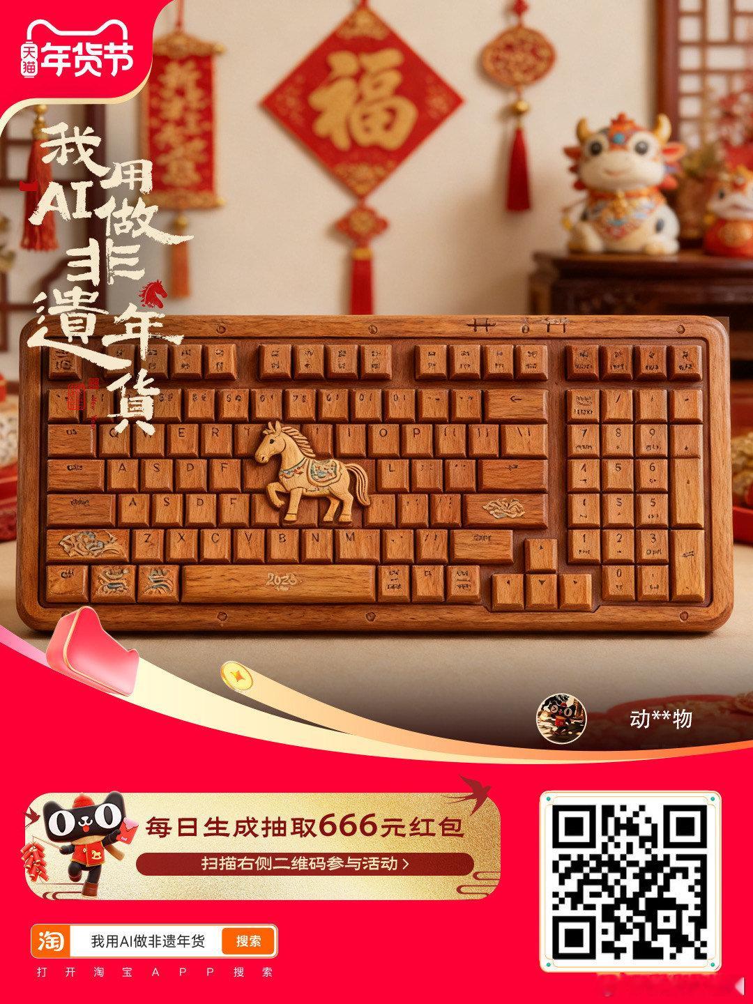 天猫年货节我用AI做非遗年货亲手造非遗年味的快乐谁懂,成就感直接拉满,文化底蕴这块狠狠拿捏~1月26日至2月2日,上淘宝搜索【我用AI做非遗年货】生成专属年货,抽666元红包!新年货玩出新花样,带份专属非遗礼回家过年~