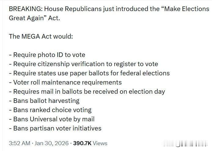 突发新闻:众议院共和党人刚刚提出了"让选举再次伟大"法案(Make Elections Great Again Act)。 MEGA法案将: - 要求投票时出示带照片的身份证明 - 要求登记投票时进行公民身份验证 - 要求各州在联邦选举中使用纸质选票 - 选民名册维护要求 - 要求邮寄选票必须在选举日当天收到 - 禁止选票收集(ballot harvesting) - 禁止排序选择投票制(ranked choice voting) - 禁止全民邮寄投票 - 禁止党派性选民倡议