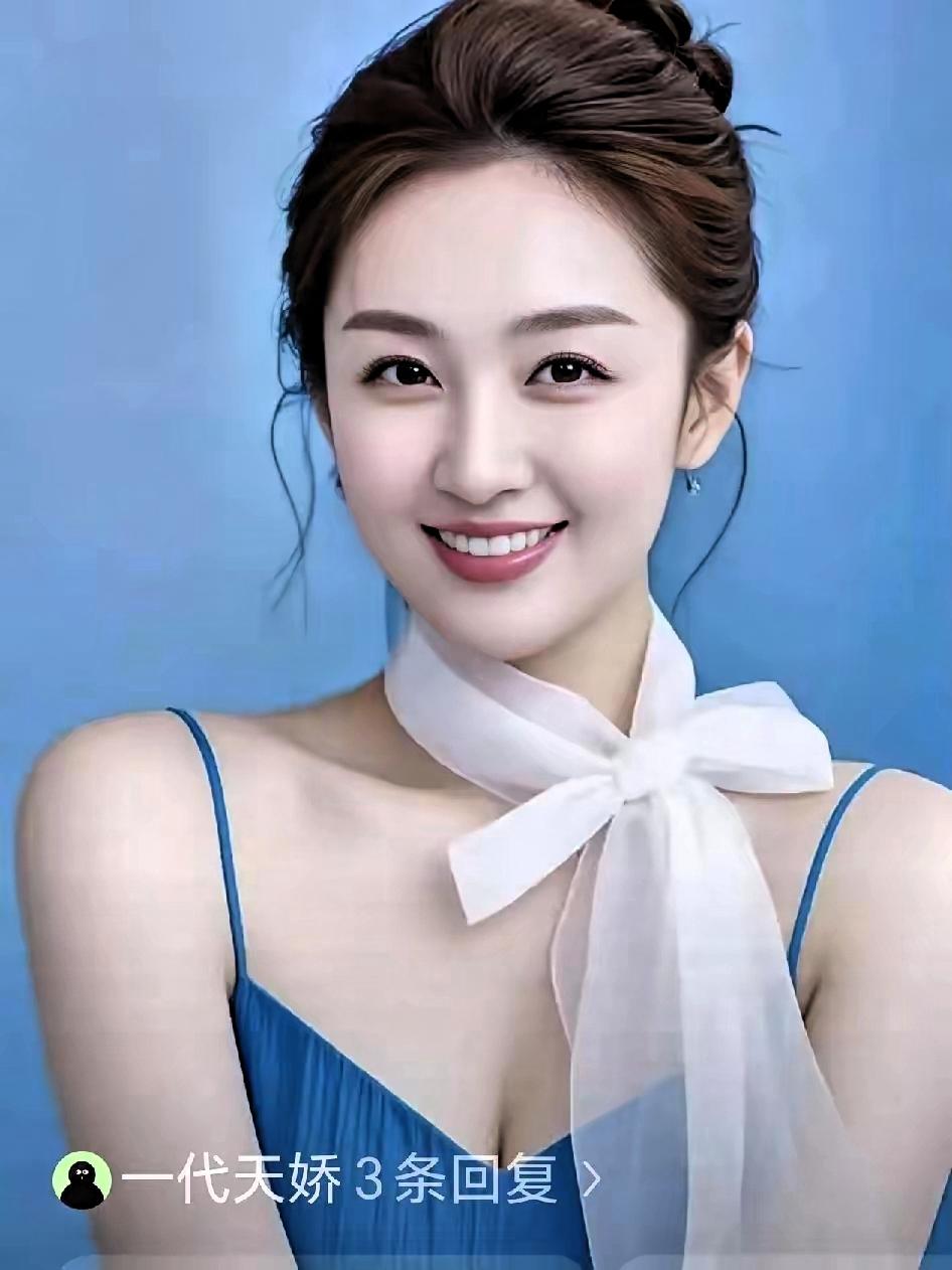 甜美笑容,优雅气质,蓝色背景下的动人瞬间。