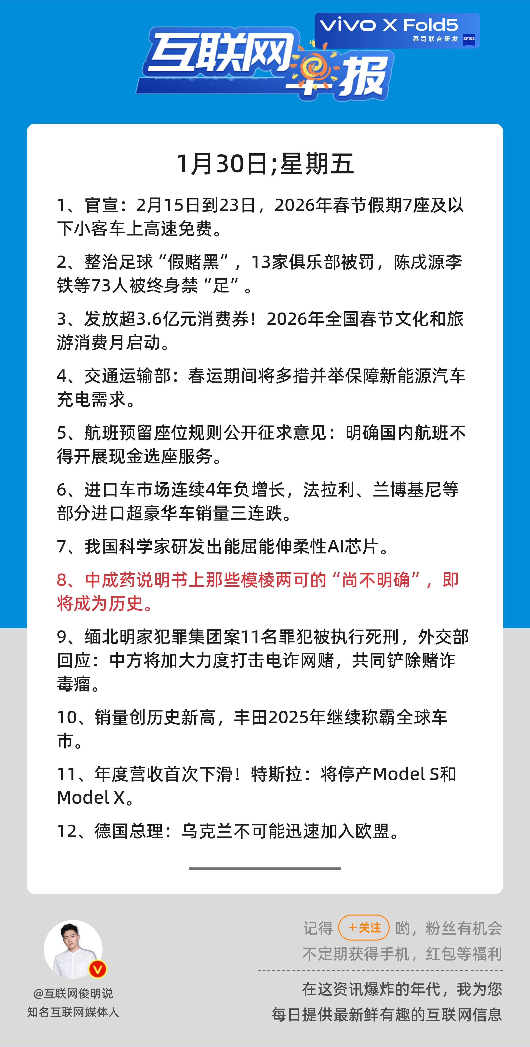 1月30日,星期五,《第3034期》;互联网早报,众览天下事关心第8条:中成药说明书上那些模棱两可的“尚不明确”,即将成为历史;早安————————————点击右上方关注每天一分钟众览天下事,互联网早报值得拥有! 更多精彩,欢迎加入粉丝群俊明和他的朋友们