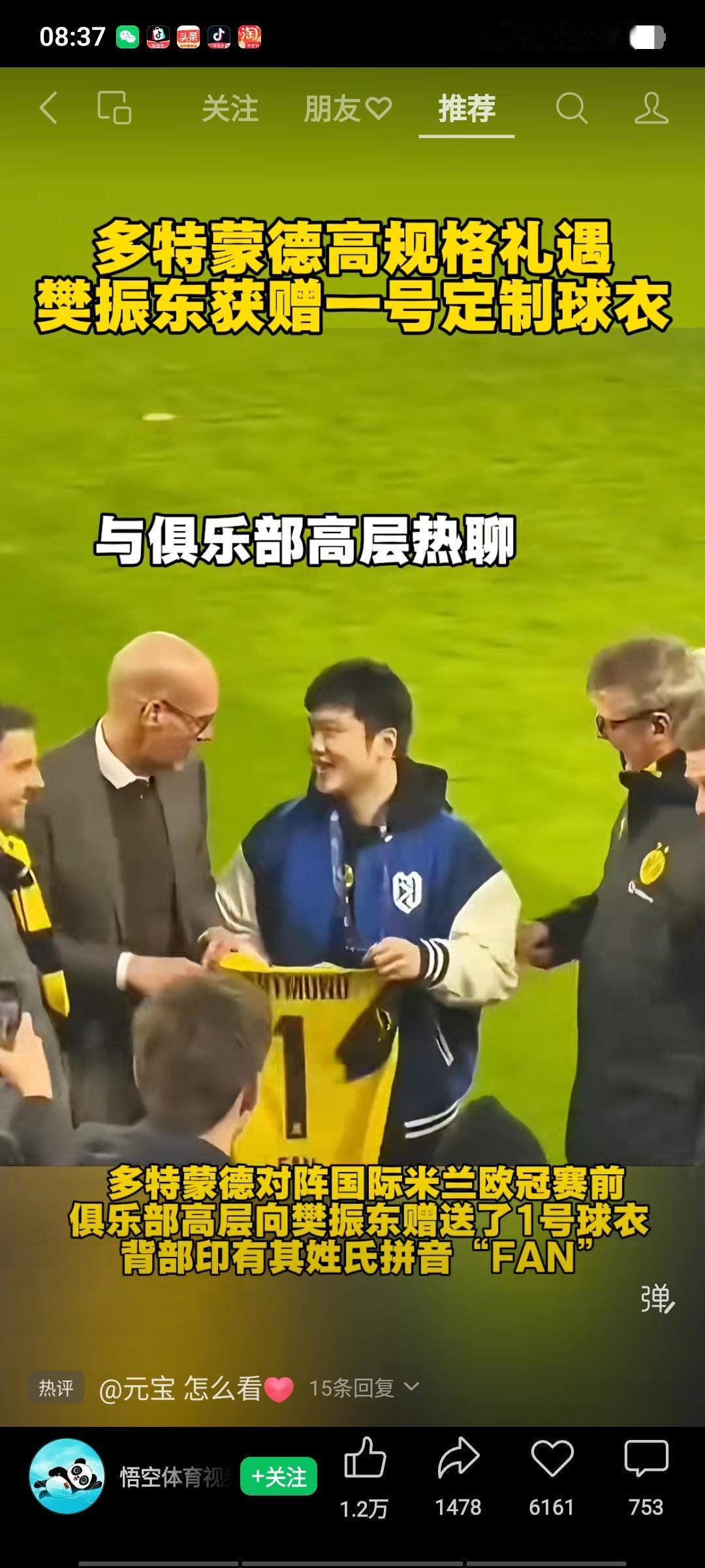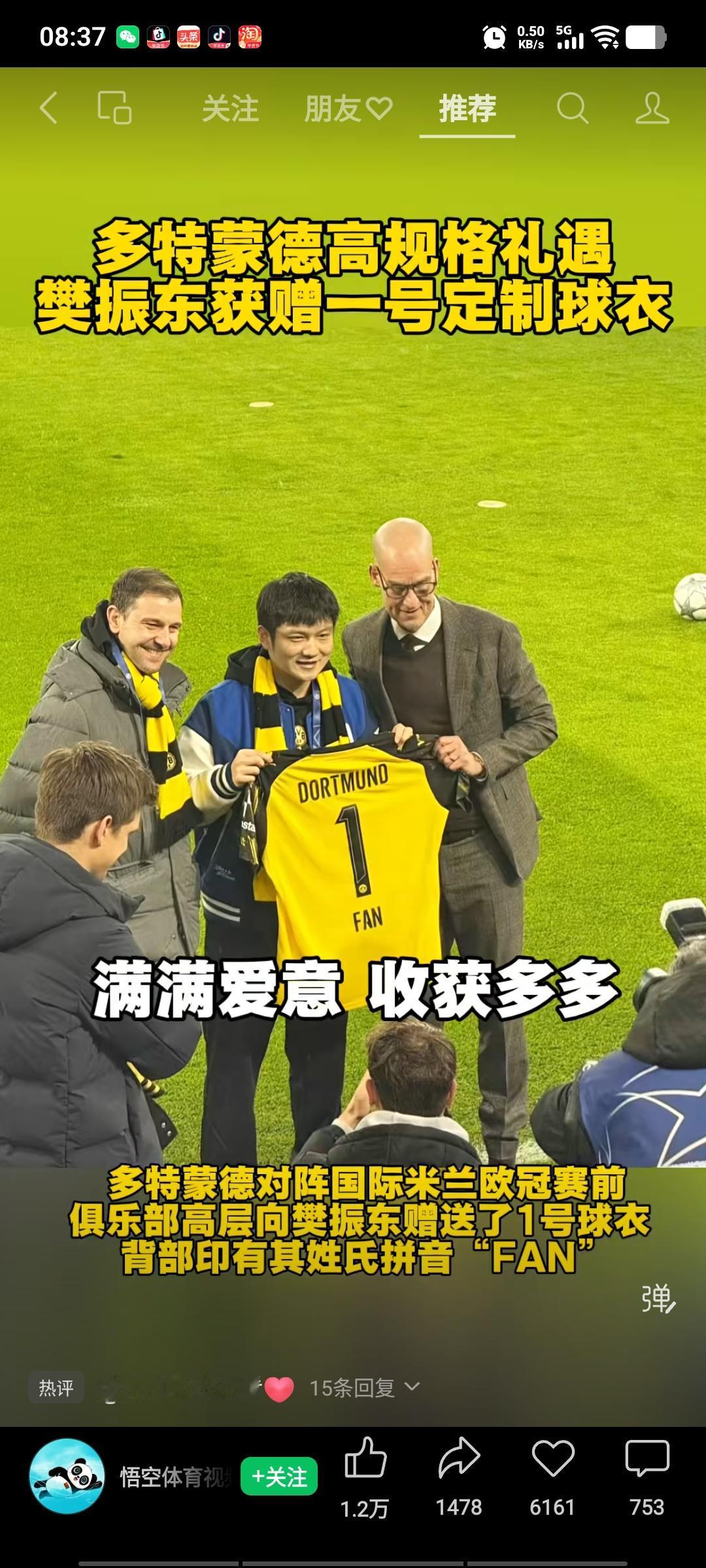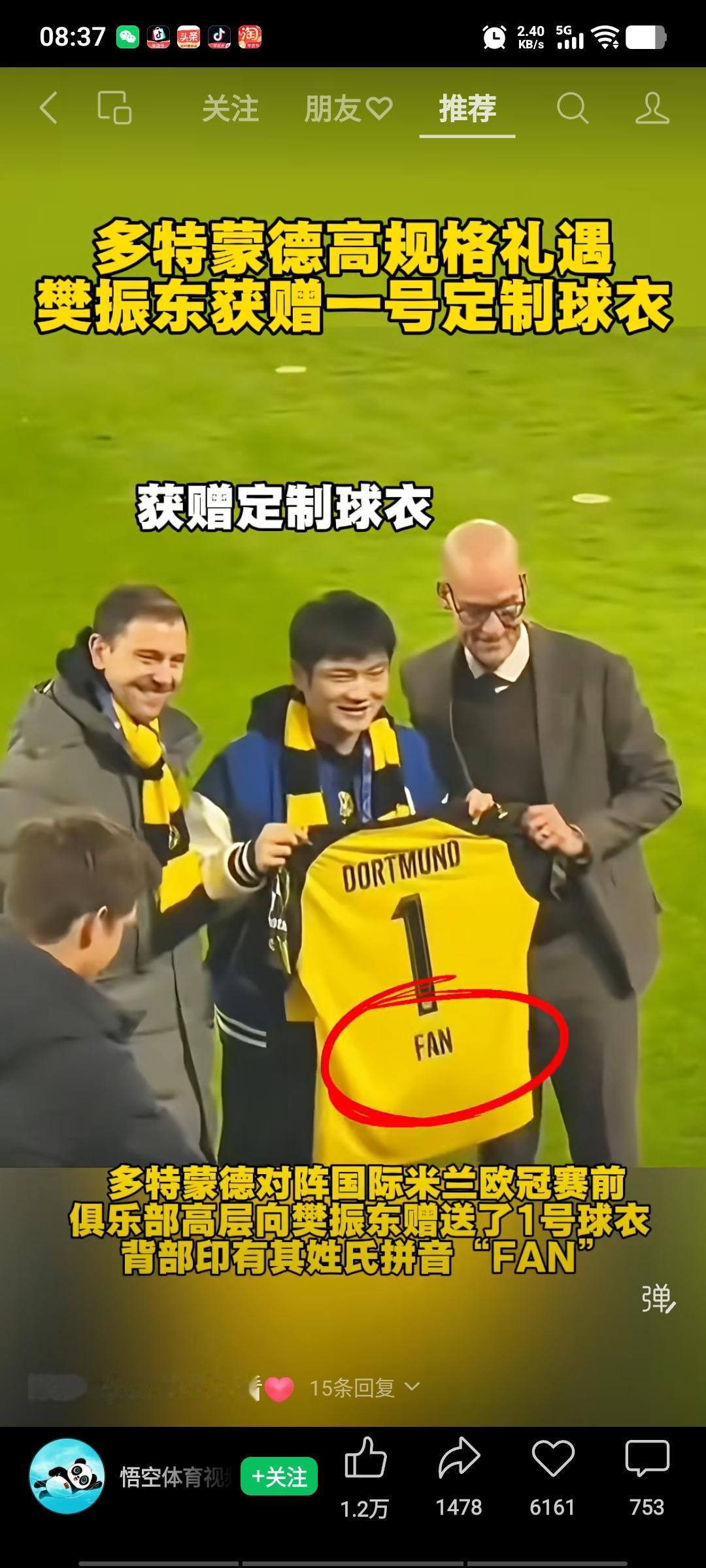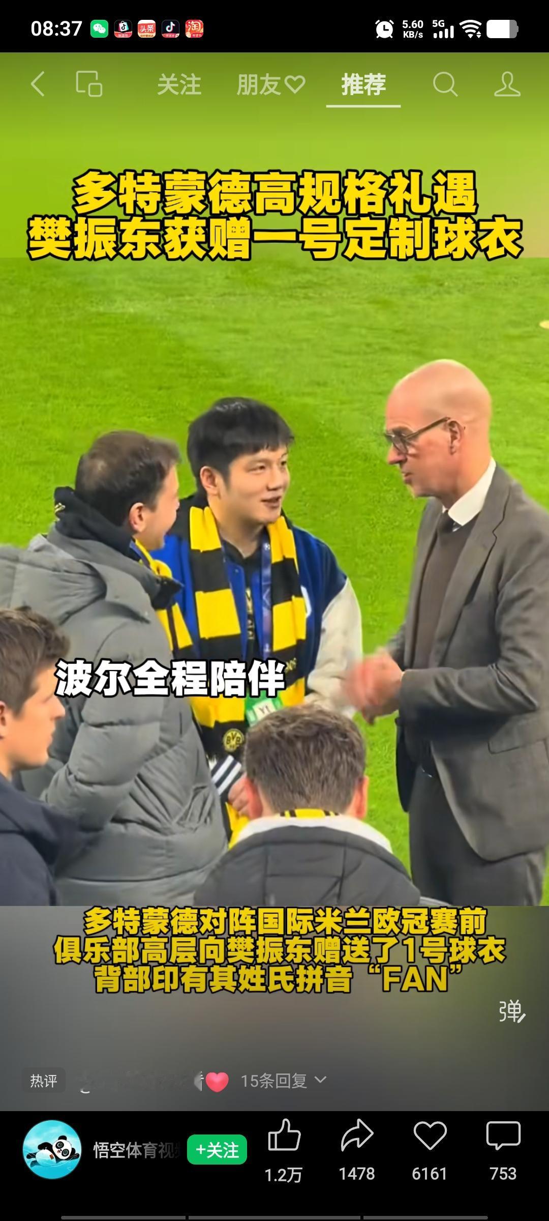 樊振东乒乓球技艺精湛,同时还是个足球迷。前天,在多特蒙德对阵国际米兰的欧冠比赛现场,樊振东以高规格待遇收获了德甲豪门多特蒙德俱乐部送出的一份特殊跨界礼物——球队为他定制了一件印有姓氏拼音“FAN”的1号黄黑主场球衣。这一暖心举动也是对东哥实力的肯定,樊振东笑得格外开心。他的好朋友波尔全程相伴,现场气氛热烈,还得到了全场观众的祝福。 樊振东的这件球衣无比珍贵,看来他这次“留洋”相当成功。正所谓“人挪活,树挪死”,是金子到哪儿都会发光。期待小胖早日找到自己的另一半,让生活更加美满。