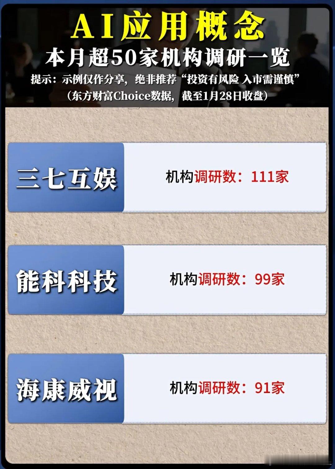 AI应用爆发前夜?50+机构扎堆调研的真相,藏着哪些财富密码?当人工智能从实验室走向产业深处,一场关于未来生产力的革命正在悄然发生。截至1月28日,东方财富Choice数据显示,本月已有超50家机构密集调研AI应用领域企业,其中三七互娱、能科科技、海康威视等公司更是成为资本追逐的焦点。这些数字背后,不仅折射出资本市场对AI赛道的强烈信心,更预示着AI应用商业化落地的黄金时代正在加速到来。从全球视角看,OpenAI的Sora模型引发视频生成技术革命,英伟达的H200芯片持续夯实算力底座,AI技术突破正以月为单位迭代升级。国内企业也不甘示弱,海康威视以AI视觉技术重构安防生态,三七互娱将大模型嵌入游戏开发全流程,能科科技用工业AI赋能制造业升级。这种技术突破与产业实践的深度融合,正在催生出千行百业的智能化变革。值得注意的是,机构调研名单中的企业呈现多元化特征。既有深耕To B领域的工业AI解决方案商,也有聚焦To C场景的消费级AI产品提供商。壹网壹创用AI驱动电商内容生产,彩讯股份以大模型重构企业通信,邦彦技术用AI算法提升网络安全防护能力。这种全产业链的繁荣景象,恰恰印证了AI技术正从单点突破走向系统性渗透。更令人振奋的是,随着国产算力芯片的突破和开源生态的成熟,AI技术的应用门槛正快速降低。京北方、宇信科技等金融科技企业已将AI技术深度嵌入银行核心系统,新开普则用AI构建智慧校园新场景。这些鲜活的产业实践表明,AI不再是遥不可及的黑科技,而是正在重塑我们生产生活方式的基础设施。站在2026年的时间节点回望,我们正处在AI应用爆发的关键路口。机构调研的热潮不仅是资本的投票,更是产业演进的风向标。当技术创新、资本加持与场景需求形成共振,一个万“智”互联的新时代已渐行渐近。对于投资者和创业者而言,当下正是布局AI应用赛道的黄金窗口期,那些真正具备技术壁垒和场景优势的企业,终将在这场变革中脱颖而出,成为定义未来的中坚力量。