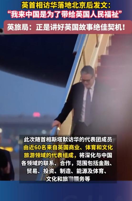 英首相访华落地北京后发文:“我来中国是为了带给英国人民福祉” ,英旅局:正是讲好英国故事绝佳契机!   就在1月28号下午,英国首相斯塔默坐飞机抵达北京,刚落地没多久就发了条消息,核心就一句话:我来中国,就是为了带给英国人民福祉。   这话一出来,不少人都在关注,毕竟这可是时隔八年,英国首相再一次来中国访问,分量确实不一般。   可能有人对斯塔默还不太熟悉,他是现在的英国首相,这次是他执政后第一次正式访华。   其实在这之前,2024年他就和中方通过电话,2025年在国际峰会上也和中方见过面,看得出来,英国工党政府上台后,就想改变之前对华关系摇摆不定的状态,想和中国发展稳定的合作关系。   这次斯塔默来中国,可不是孤身一人,身后跟着近60名代表,涵盖了商业、体育、文化旅游等好几个领域。   说白了,他这次来,就是想实打实和中国谈合作,毕竟中国是英国第三大贸易伙伴,不管是金融、贸易还是能源领域,合作好了,对英国经济的帮助都不小,这也是他说“为英国人民福祉”的底气所在。   这边首相刚落地发文,英国旅局那边就立刻表态,说这次首相访华,正是向中国市场讲好英国故事、和中国文旅行业深入交流的绝佳契机。   这话其实一点不夸张,中国游客对英国旅游业太重要了,他们预估,到2026年,去英国旅游的中国游客能达到64.1万人次,比今年增长31%,而且后续消费还会逐年增加。   英国旅局也早有准备,一直在推“星耀英伦”的推广活动,借助《浴血黑帮》这些大家熟悉的影视作品,吸引中国游客去英国的各个城市,不只是伦敦,还有曼彻斯特、巴斯这些地方。   这次借着首相访华的热度,刚好能让更多中国人了解英国的旅游资源,也能促成更多文旅方面的合作。   我个人觉得,斯塔默说的“带给英国人民福祉”,本质上就是务实合作,英国这些年经济压力不小,和中国深化合作,不管是贸易往来还是文旅交流,都能拉动当地就业、增加收入,老百姓能实实在在受益。   而英国旅局抓住这个契机,也是双赢,既能吸引更多中国游客,也能让中英之间的文化交流更深入。   目前中英之间的直飞航线已经恢复得很好了,每周有两百多班次,去英国越来越方便。   后续随着这次访华的合作落地,大概率还会有更多直飞航线开通,旅游产品也会更丰富。   不管怎么说,时隔八年的首相访华,本身就是个好信号,只要双方都抱着务实的态度,多沟通、多合作,最终受益的还是两国的老百姓。