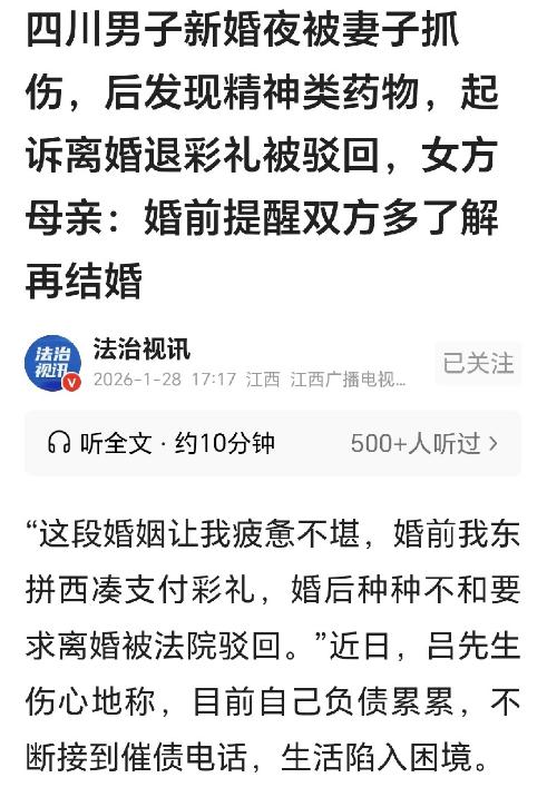 离大谱了!四川达州,一男子新婚燕尔,想和新娘过夫妻生活,可妻子拒绝,一把抓他脸上,男子脸被抓花,怀疑妻子心里有别人,妻子说自己生理期,男子耐心等了几日,谁知他刚想好事,妻子又把他脸抓花,男子一气之下,离家出走,半年才回来,他打开柜子,发现一瓶“利培酮片”,上面写着妻子名字,这是一种js类药物,男子怀疑女子骗婚,他告到法院,要求和妻子离婚,并返还11万彩礼,结果令人意想不到!   四川达州宣汉县,38岁的吕先生是名货车司机,常年在广东跑货运,辛苦攒钱买了房装了修,就盼着成个家安稳下来。   2024年9月,经同村媒人介绍,他认识了比自己小8岁的李巧,李巧念过大学、当过老师,看着斯文内向,吕先生一眼就有了好感。   两人先是微信联系,后来吕先生特意开车去重庆见了李巧,还带她去广东住了20天,相处下来没发现啥异常,双方家长也都满意。   就这样,两人进展很快,2025年1月13日婚检领证,1月21日摆了40桌酒席,吕先生前前后后给了11万多彩礼,还有金银首饰,满心欢喜盼着开启新生活。   可新婚当夜,宾客散去后,吕先生想和妻子过夫妻生活,却被李巧当场拒绝,还一把抓在他脸上,瞬间就抓出了血,脸直接被抓花。   吕先生又疼又疑惑,怀疑妻子心里有别人,反复追问,李巧只说自己在生理期,吕先生虽有不满,也只能耐着性子等。   可等了几天,吕先生以为妻子生理期过了,再想亲近时,又被李巧抓花了脸,这一次,吕先生彻底寒了心,一气之下收拾东西回了广东,整整半年没敢回家,心里又委屈又不解,不明白自己到底做错了什么。   2025年10月,吕先生实在放不下这件事,特意回了趟老家,打开家里的柜子时,无意间发现了一瓶利培酮片,药盒上赫然写着李巧的名字。   他赶紧查了下,这是一种治疗精神分裂症的精神类药物,能缓解幻觉、妄想等症状,购药时间还是2025年8月。   那一刻,吕先生浑身发凉,瞬间明白了妻子为啥一直抗拒自己,还两次抓他脸,他怀疑李巧婚前故意隐瞒精神病史,自己这是遭遇了骗婚。   说白了,换做谁遇到这种事,都会崩溃,毕竟11万彩礼是他东拼西凑,甚至透支信用卡凑来的,满心欢喜娶的媳妇,竟然藏着这么大的秘密。   吕先生当即下定决心离婚,还卖掉小车凑了律师费,2025年11月18日,他向宣汉县法院起诉,要求和李巧离婚,并返还11万多彩礼,说两人婚后压根没过上夫妻生活,感情早就破裂了。 庭审时,李巧却不承认,说两人有过夫妻生活,还辩称吕先生起诉的都是假的,甚至说吕先生回家后换了门锁、停了水电气,两人感情没到破裂的地步,彩礼也不该退。   李巧的母亲也说,婚前提醒过吕先生多了解再结婚,吕先生早就知道女儿的情况,不存在骗婚。   谁也没想到,法院最后的判决让人意外,法院认为,虽然两人新婚就起了矛盾,但2025年5月20日,吕先生还曾给李巧转了520元、送了鲜花,说明双方还有和好的可能,夫妻感情没完全破裂,最终驳回了吕先生的诉讼请求。   吕先生彻底懵了,他说自己本来想上诉,可实在没钱付律师费,现在还天天被银行催债,生活全被打乱了。   其实这事说到底,最关键的就是李巧到底有没有婚前隐瞒病史,如果真的隐瞒了,吕先生选错了诉讼方式,本该申请撤销婚姻,而非起诉离婚,现在闹到这个地步,没有赢家,只希望后续能有一个合理的解决办法。