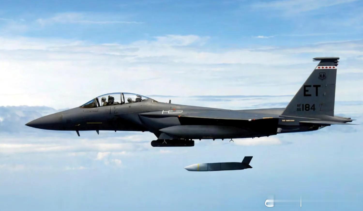 2018年美国空军F-15E战斗机发射JASSM(Joint Air-to-Surface Standoff Missile联合防区外空地导弹)导弹,增程型(射程925公里)是原先射程的2.5倍军事历史全触达