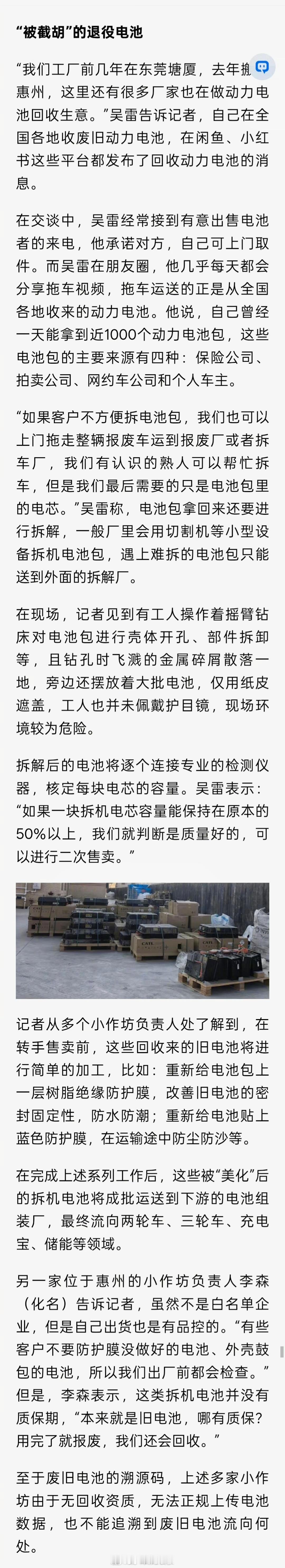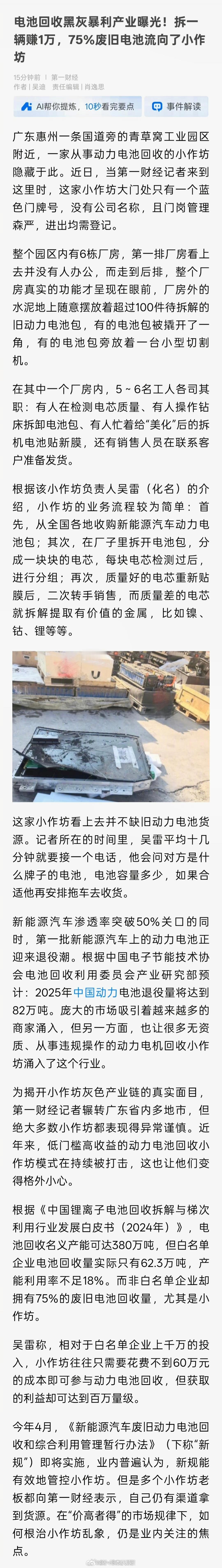 小作坊拆1辆新能源车赚1万小作坊翻新旧电池,以次充好赚快钱。一片100Ah旧电池净赚50元,翻新一辆车电池包可赚约1万元。缺货时用容量更低的电池冒充,称“客户会体谅”。报废电池则按废品卖,每安时约0.3元,或按金属行情论斤回收。新能源汽车