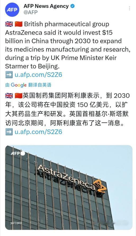 英国宣布了一条让特朗普恼羞成怒的新闻! 法新社1月29日晚报道:“英国制药集团阿斯利康表示,到2030年,该公司将在中国投资150亿美元,以扩大其药品生产和研发。英国首相基尔·斯塔默访问北京期间,阿斯利康宣布了这一消息。” 这哪是商业投资,分明是英国当着美国的面,给了特朗普一记响亮的耳光。特朗普这会气不顺,全是自找的。 他一直把遏制中国当成头等大事,尤其盯着生物医药这种关键领域。2025年2月,他还专门发了个《美国优先投资政策》备忘录,核心意思就一条:经济安全就是国家安全,必须盯着中国这个“对手”,绝不能让中国在生物技术这些领域赶上来。 为了卡中国生物医药的脖子,特朗普政府想了不少狠招。一边要扩大外国投资委员会的审查范围,不管是私募股权、风险投资,还是新建工厂,只要和中国生物医药沾边,都要严格管控,甚至直接禁止中国企业收购美国相关资产。 另一边还在推动“生物安全法案”,想切断中国生物医药外包企业和美国联邦资金的合作,逼着美国药企把研发生产从中国迁走。更狠的是,他们还打算出行政命令,限制美国药企和中国合作,连中国的临床试验数据都要额外加钱审查,摆明了就是要搞技术封锁。 特朗普之所以这么紧张,就是因为中国生物医药的发展速度,远超美国的预料。以前全球创新药都是欧美说了算,可现在中国已经追上来了。 2025年中国创新药对外授权交易总金额超过1300亿美元,占了全球近一半,比美国还多。美国自己的报告都急了,说再不给力,未来三年就会彻底失去在生物技术领域的领导地位,以后说不定很多药都要靠中国生产。 更让美国头疼的是,他们的生物医药产业链根本离不开中国。有数据显示,79%的美国生物制药公司都要靠中国的外包服务完成生产流程,像布洛芬、对乙酰氨基酚这些常用药,90%以上的原料药都从中国进口。 特朗普想逼着产业回迁,可美国药企根本不买账,因为中国有完整的产业链、充足的人才,还有超大的市场,离开中国只会增加成本、拖慢研发进度。 特朗普本来还指望盟友们跟着他一起遏制中国,尤其是英国这种传统盟友,更是被他划进了“快速通道”伙伴名单,承诺给英国企业投资开绿灯,条件就是别和中国合作。 可他万万没想到,英国转头就给了他一个下马威,偏偏在首相访华期间,让阿斯利康宣布这么大一笔对华投资,这不是公开拆台是什么? 阿斯利康这笔150亿美元的投资,可不是随便做做样子,每一分钱都扎在美国的痛处上。这笔钱会用来深化在北京、上海的全球战略研发中心布局,这些中心已经和国内500多家临床医院合作,过去三年主导了不少全球临床试验。 同时还要升级无锡、泰州、青岛、北京的生产基地,说不定还要新建基地,这些基地现在已经能给全球70多个市场供药,以后产能只会更强。 更关键的是,投资重点放在了细胞治疗、放射偶联药物这些前沿领域,专门针对癌症、血液病这些大病。阿斯利康还会和中国的西比曼、石药集团等企业合作,把中国的创新药带到全球。 要知道,阿斯利康2025年刚在中国投了25亿美元建研发中心,才过一年又加码150亿,足见中国市场和技术实力有多吸引人。按照计划,投资完成后,阿斯利康在华员工会超过2万人,还能带动整个医疗行业新增数千个岗位。 阿斯利康的选择,其实就是全球企业的心声。中国现在不只是医药消费大国,更是创新大国,有完整的研发、生产链条,还有稳定的市场环境。 对跨国药企来说,错过中国就等于错过未来的发展机会。英国政府显然也看清了这一点,斯塔默首相亲自带队访华,让阿斯利康同步宣布投资,就是要抢占中国生物医药市场的先机,根本不会跟着特朗普的糊涂政策走。 这事儿最让特朗普恼火的是,他费尽心机构建的遏制体系,被盟友轻易打破了。美国本来想靠封锁、限制,迟滞中国生物医药的发展,可中国不仅没被卡住,反而吸引了更多国际巨头加码合作。以前特朗普总说要让盟友和中国脱钩,现在倒好,英国反而主动和中国绑得更紧,这不是打他的脸吗? 其实说到底,特朗普的遏制政策本身就不符合市场规律。中国生物医药能发展起来,靠的不是别人的施舍,而是自身的投入和积累,从研发到生产,从人才到市场,都形成了自己的优势。 美国想靠行政命令逆市场而行,本身就不现实,再加上盟友们各有算盘,没人愿意为了美国的私利牺牲自己的利益。 阿斯利康这笔投资,也给其他国家提了个醒:和中国合作才能共赢,跟着美国搞遏制只会错失良机。 特朗普再恼羞成怒也没用,他改变不了中国生物医药崛起的趋势,更拦不住各国企业和中国合作的脚步。以前美国总想卡别人脖子,现在才发现,自己的那套办法根本行不通,反而让盟友都离自己越来越远。
