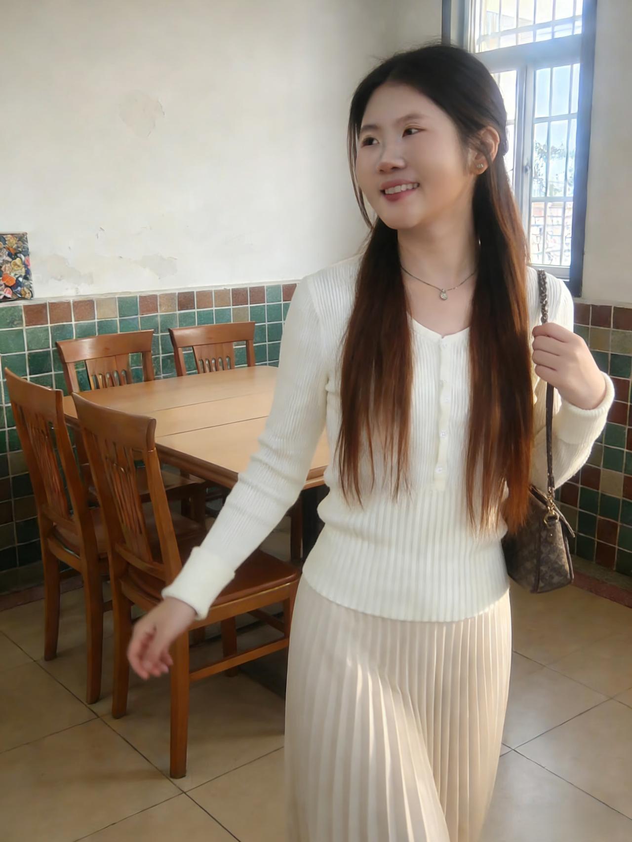 白裙是最干净的注脚 针织衫的纽扣扣住了松弛 链条包是唯一的旅人 带着别处的风尘 阳光在你身上铺成薄纱 让每一根发丝都有了重量 你望向镜头,像在说 “此刻,我在这里” 在所有流动的日常里 站成一幅可以触摸的静物