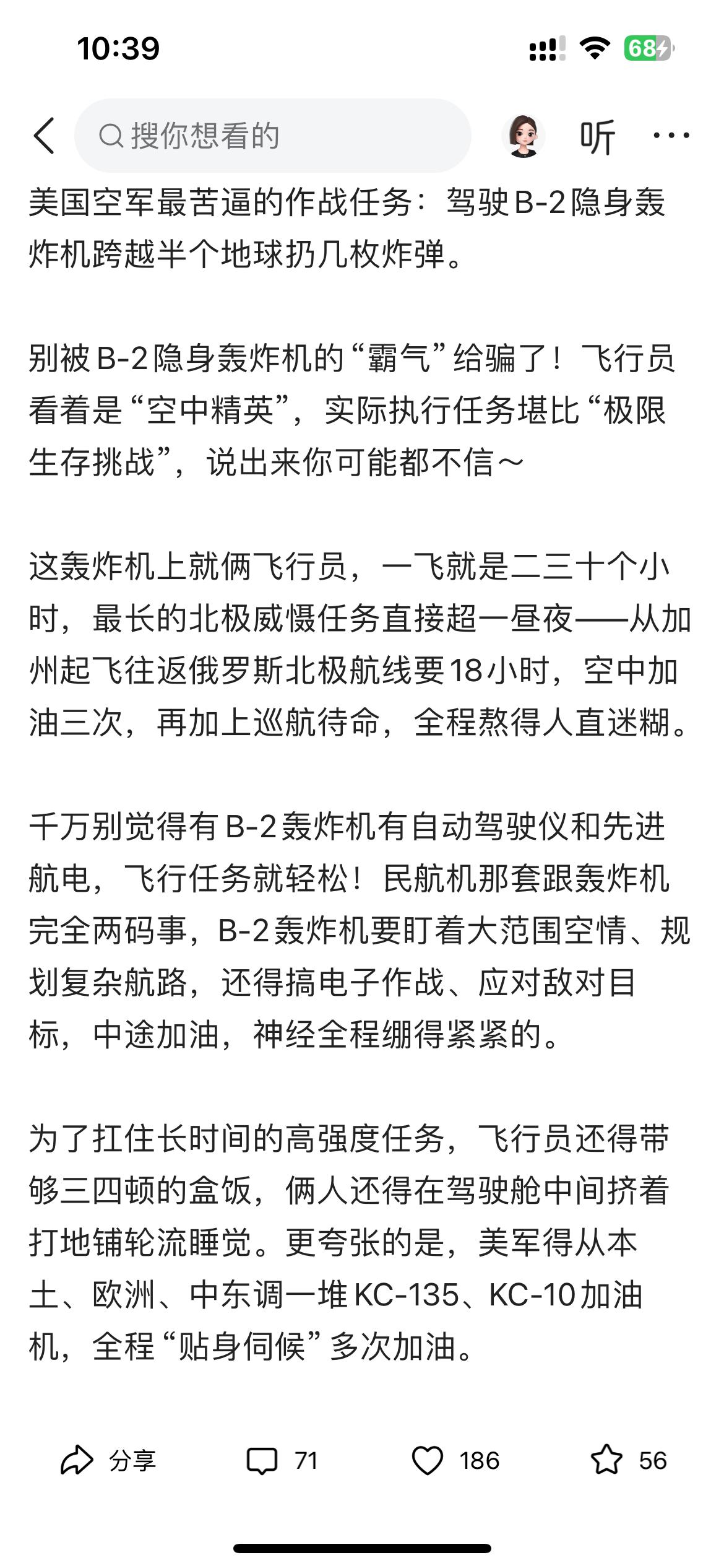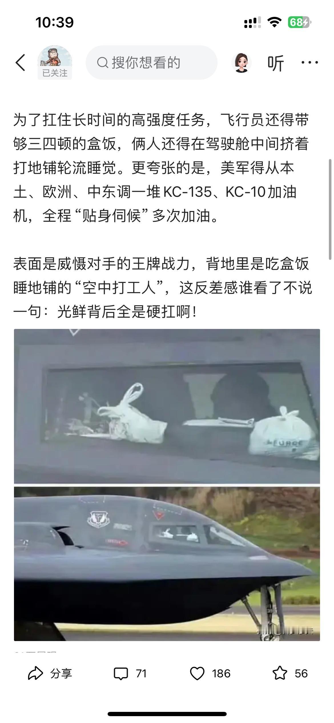 B-2“幽灵”战略轰炸机的飞行员战斗模式这么苦逼悲催么?一次B-2“幽灵”战机全球范围的战略轰炸,飞行员要带够三四顿的盒饭果腹! 这盒饭带的很接地气,塑料袋一装,驾驶舱风挡玻璃一放,真的是随性而为,难道B-2轰炸机驾驶舱没有装个冰箱保鲜吗? 有时B-2战机的一次的飞行任务时长高达二十三四个小时,没有冰箱保鲜,盒饭会不会变质,飞行员吃坏了肚子有点划不来!