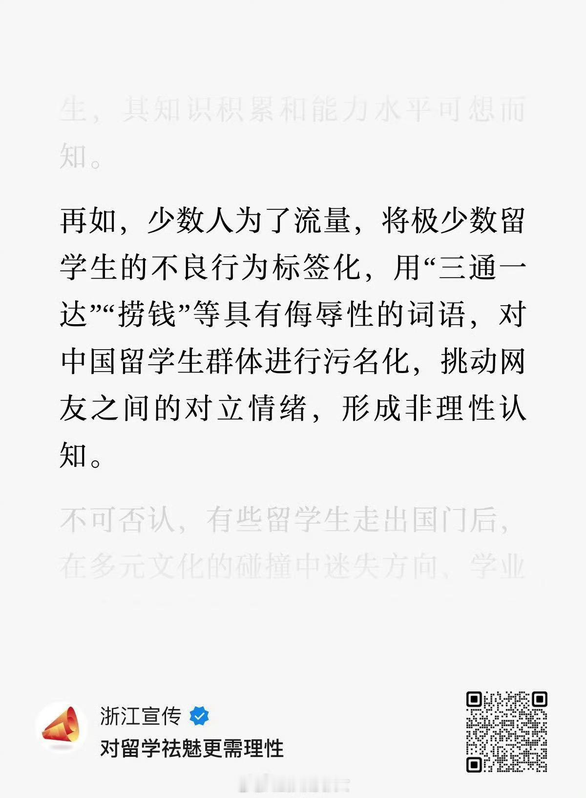 浙江宣传:少数人为了流量,将极少数留学生的不良行为标签化,用“三通一达”“捞钱”等具有侮辱性的词语,对中国留学生群体进行污名化,挑动网友之间的对立情绪,形成非理性认知。