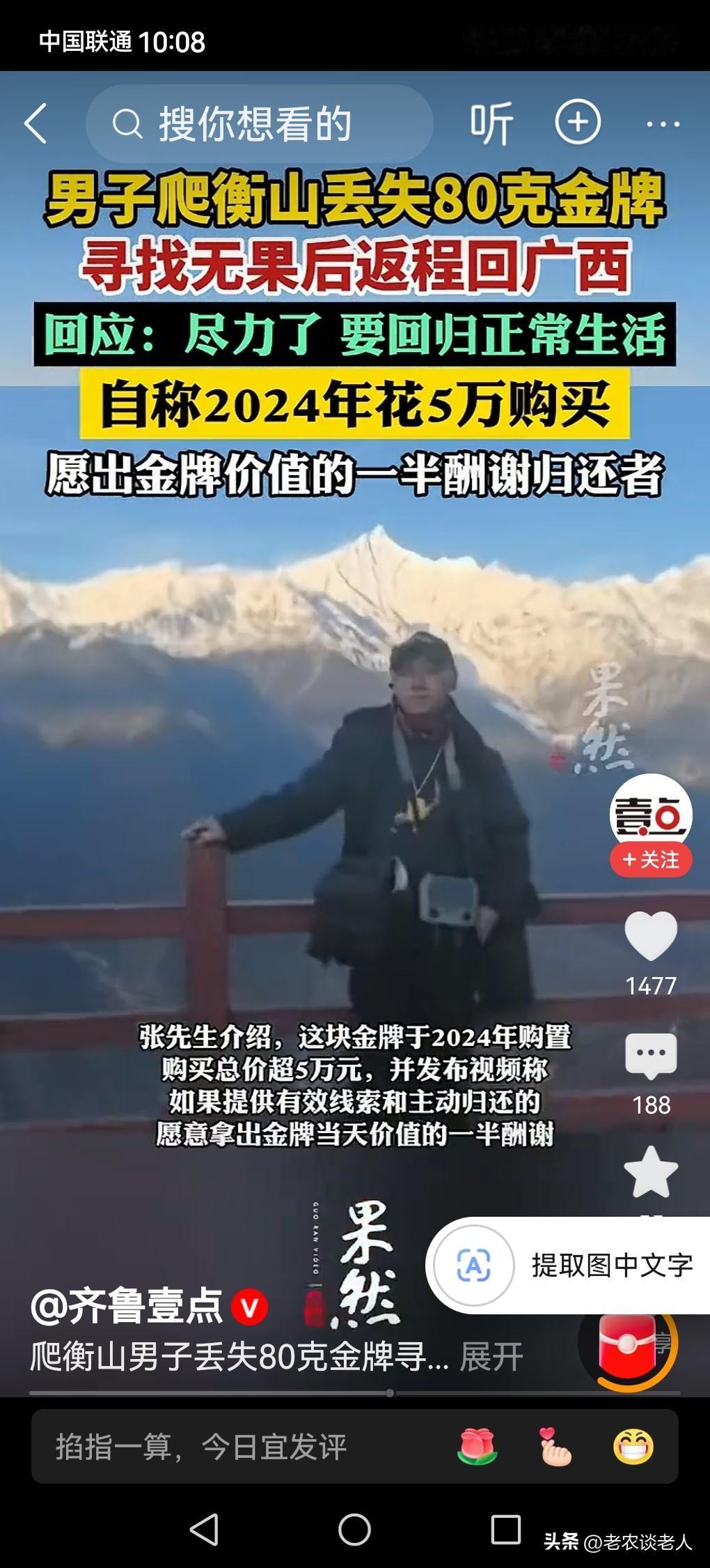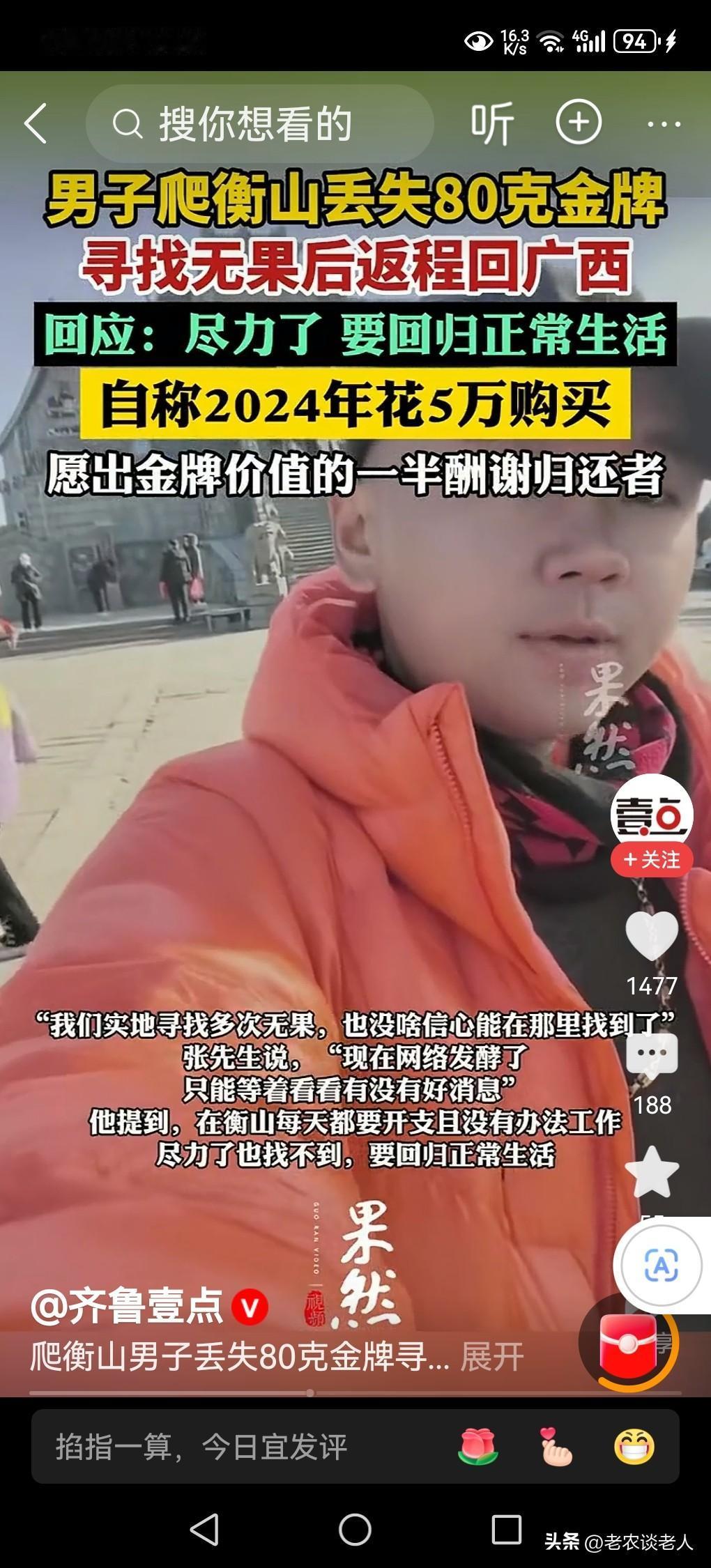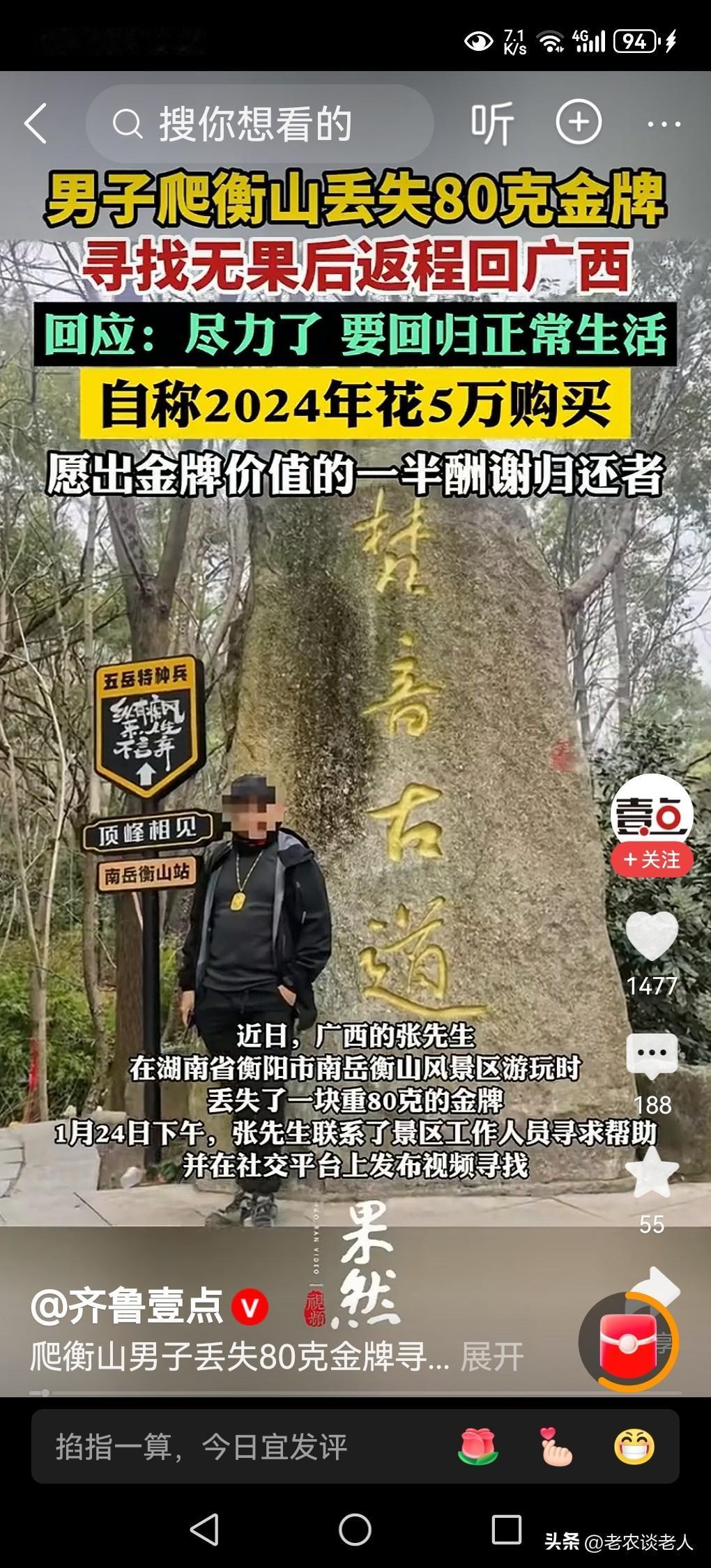 爬衡山丢80克金牌男子寻找无果返程 出外旅行,徒步爬山,丢失贵重物品的事情是一件屡见不鲜的事情,时有发现。 当游客丢失了贵重物品以后,经过多次寻找无果,心里十分着急,若是放弃寻找,于心不忍,但又无可奈何,不得不放弃,是人之常情,大家都能理解。 据媒体1月30日报道,广西游客张导游,于1月24日在南岳衡山梵音古道登山时,佩戴的金项链的金吊坠牌子因突然断裂,重约80克、市值约10万元的金吊牌被遗失。张导游随即折返寻找并报警,在网络平台上发布了相关悬赏视频,迅速引发网络关注。 张导游丢失金牌以后,在所发布的视频上承诺,按当日金价一半给予捡拾者酬谢,该承诺具有法律约束力。并表示,如拾得者临时要求增加赏金,失主有权拒绝;若以拒不归还相要挟强行索要高价,则可能涉嫌敲诈勒索。张导游后来又在官方平台发布悬赏,对于捡到和归还者奖励6666元,捡到遗失物不归还属于“不当得利”,可能涉嫌犯罪。 透过此事例,回到我们的现实生活中来,本人认为: 一,春节临近,过年长假将至,出外旅游是人们的日常生活的一部分。在外出旅游的时候,提醒游客一定要管理好自己贵重的物品避免遗失丢失。因为贵重物品一旦丢失,被一些道德有瑕疵的捡拾者,捡到以后,便销声匿迹,不会归还,寻找是没有结果的,很难找到。 二,任何人在捡拾到贵重物品以后,一定记住,要么寻找失主,归还遗物,要么就近交给相关部门处理,千万记住,不要据为己有,拾到的任何财物,都是人家的,千万不要见财起意,贪婪独自吞噬。因此,要做一个讲文明,有修养,有道德,做一个合格的拾金不昧,大公无私的人。 三,在野外捡拾到的任何遗物,都是他人财产,千万不要隐瞒和独吞据为己有,否则,一旦发现,所捡拾到的遗失物品,不愿意归还,纯是属于不正当得利,很有可能涉嫌犯罪,构成违法犯罪行为。现在的社会是一个法治社会,是有法可依的,奉劝那些捡拾者,一定要好自为之,遇事三思而行,千万不要把所捡到的东西据为己有,既不道德,又是违法犯罪的行为。 以上是本人观点,如有不妥,请大家在留言区处留下你宝贵的意见。