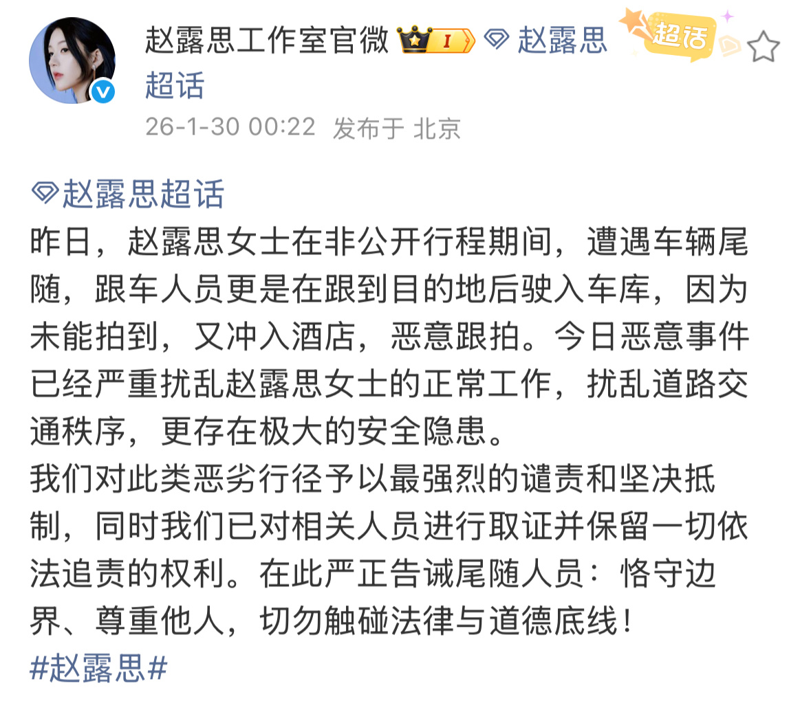 赵露思工作室发文,有人尾随赵露思导致赵露思车辆被追尾了,还跟到酒店。。。好离谱,这到底是些什么人啊?