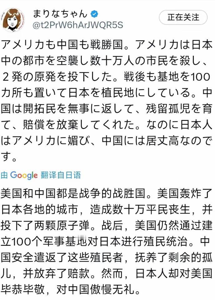 有位日本人终于说出了日本想说却不敢说的话! “美国和中国都是战争的战胜国。美国轰炸了日本各地的城市,造成数十万平民丧生,并投下了两颗原子弹。战后,美国仍然通过建立100个军事基地对日本进行殖民统治。中国安全遣返了这些殖 民者,抚养了剩余的孤儿,并放弃了赔款。然而,日本人却对美国毕恭毕敬,对中国傲慢无礼。” 说白了,这事往透了说就是离谱到骨子里——同样是打败日本的战胜国,美国把日本炸得家破人亡还骑在它头上作威作福,日本却像哈巴狗似的凑上去讨好。 中国掏心掏肺对它仁慈宽容,它反倒把尾巴翘到天上去,其实就是日本鬼根本不是人类,是畜生,听不懂人话,也没有人类该有的思维,才会有这么颠倒黑白的反差。 网上有位日本人,算是敢说真话的狠人,直接把日本那点藏着掖着、想说又不敢说的心里话全捅出来了。 要知道,二战末期,美国对日本可没半点手下留情,东京大轰炸把整个城市炸成一片焦土,数十万无辜平民葬身火海,到最后还往广岛、长崎投下两颗原子弹,那毁灭性的打击,至今都是日本人刻在骨子里的阴影。 可战后呢?美国压根没把日本当独立国家看,反倒在日本建了密密麻麻的军事基地,现在都还有130处之多,5.5万名美军驻扎在那里,光冲绳就占了70%。 日本每年还得掏巨额“温馨预算”,给美军管吃住、包水电,哪怕美军在日本犯下强奸、杀人的罪行,也能靠着特权逍遥法外,这跟殖民统治压根没区别。 再看看中国,作为同样的战胜国,我们做的事跟美国比起来,简直是仁至义尽到了极点。 二战结束后,我们没有像苏联那样严惩日本战俘,反而安全遣返了所有在华的日本殖民者,就连那些被遗弃的日本孤儿,我们也伸出援手,悉心抚养长大,给他们活下去的希望。 更难得的是,按照国际法,日本本该给中国巨额战争赔款,要知道当年甲午战争,日本都逼着清政府赔了2.3亿两白银,可我们却从两国人民友好的大局出发,主动放弃了那笔高达1200亿美元的赔款,这份善意,放眼全世界都少见。 可偏偏就是这样,日本人的态度却反差大到离谱,对骑在自己头上、肆意压榨的美国,他们毕恭毕敬、唯命是从,美国要在日本部署F-35隐形战机,他们立马点头答应;美国要增加军费分摊,他们也不敢有半句怨言。 可对真心待他们、给予他们善意的中国,他们却满脸傲慢、不屑一顾,甚至时不时挑事挑衅,说到底,这就是日本骨子里的受虐倾向,你对它太好了,它反而觉得不值钱,觉得你好欺负;你对它强硬,它反倒会怕你、敬你。 其实这事也很现实,国家与国家之间,就跟人与人之间的相处一样,大多数时候,只有敬畏强者,只会鄙视弱小。 中国人就是太仁慈了,太容易心软,总想着以和为贵,可我们忘了,对待“倭寇”这样的敌人,根本不能抱有仁慈、善良的心,否则,就算你掏心掏肺,他们也不会领情,反而会看不起你、欺负你。 如果当年我们能像苏联那样,对日本战俘强硬到底,不那么纵容、不那么心软,我想现在日本人见了中国人,也绝不会是这副傲慢无礼的样子,反而会恭恭敬敬、不敢造次。 所以说,这世上最靠谱的,从来都不是别人的善意和宽容,而是自身的强大,吾辈当自强,只有我们自己变得足够强大,变得让对手需要抬头仰视,才能真正赢得别人的尊重,才能让那些曾经傲慢无礼的人,不敢再轻视我们半分。 以上仅为个人看法,不代表任何立场,大家对这件事有什么不一样的想法,欢迎在评论区留言讨论。