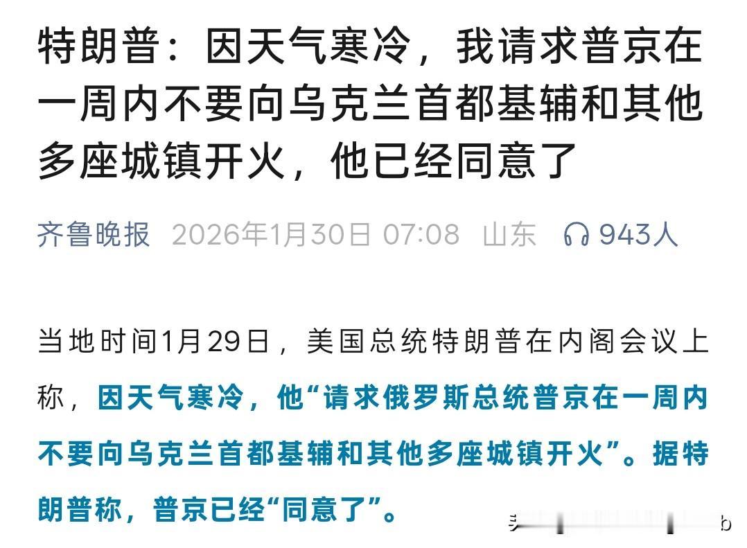 俄军暂停空袭乌能源设施,停火真能撑过这个冬天? 这几天,基辅冷得要命,零下20度,水管冻裂,暖气停了,医院靠发电机撑着。听说俄军真没再炸变电站和电厂,不是嘴上说说,是乌军和海妖特战队的人都确认了。 这事儿不是泽连斯基先提的,也不是普京点头的,是特朗普那边先吹风说,因天气寒冷,他已请求普京在一周内不要向乌克兰首都基辅和其他多座城镇开火。接着俄方博主爆出了1月28号的内部命令,乌方才跟着表态“愿意遵守”。没人签协议,也没监督员,就是一种默契。 打仗打到现在,顿巴斯绞肉机谁都啃不动;俄罗斯砸钱造导弹;乌克兰靠外援活着,可欧盟的钱卡在匈牙利那不放,美国也不白给了。 冷天逼人低头,不是因为怕输,是怕人冻死。红十字会的车已经开始往前线送煤和电热毯,电厂抢修队连夜干活。 要是下周暖气还没通上,空袭又响起来,那这“停火”就只是冻僵时打了个寒颤。 对于基辅的平民来说,这短暂的停火是救命稻草;对于前线的士兵,这可能是重整装备的窗口;而对于决策者,这又或是算计筹码?停火能撑到解冻那天?