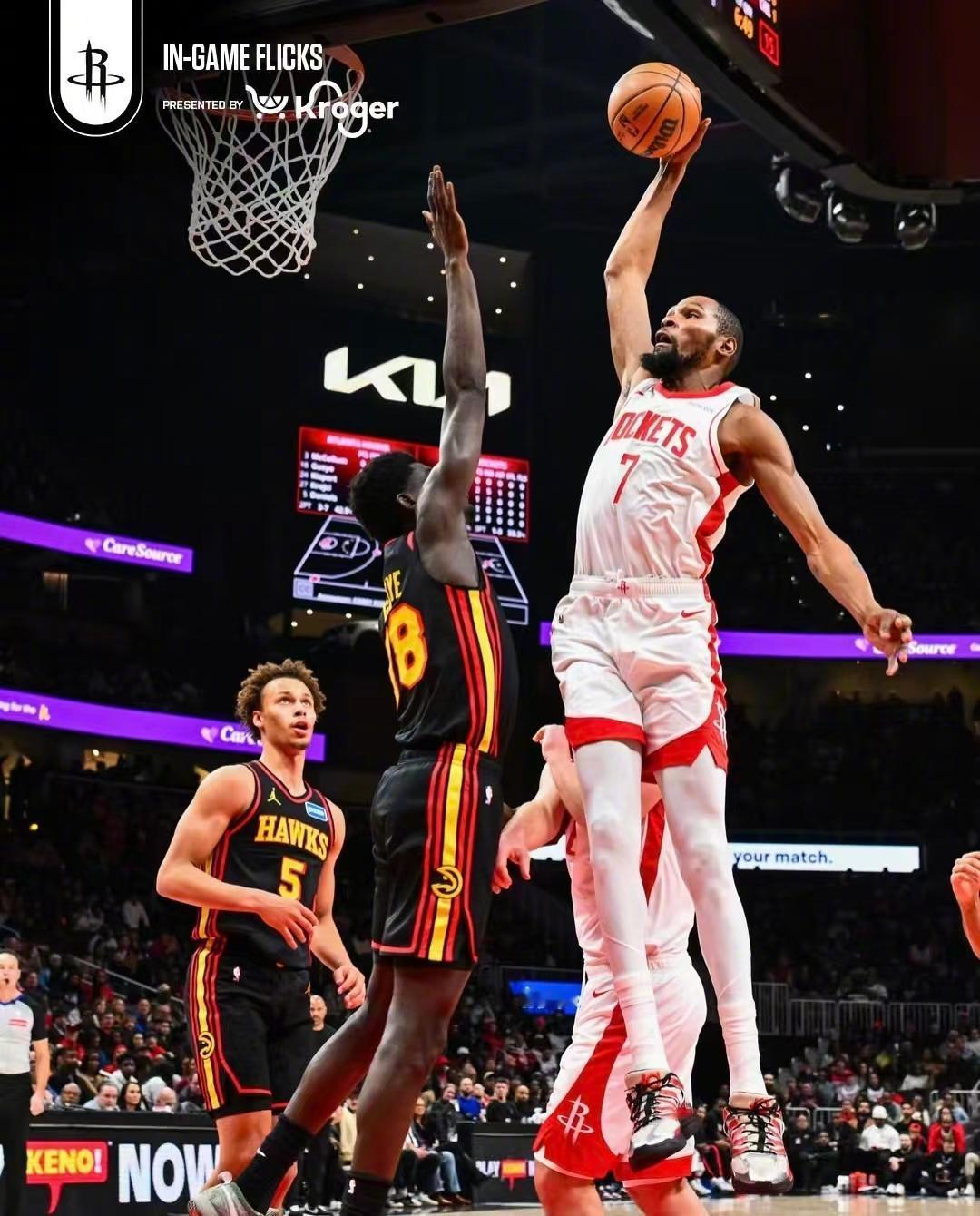 今天的背靠背,杜兰特“只”打了34分钟。 倒不是乌度卡突然开窍了,毕竟第四节都领先二十多分的情况下,还是把主力放在场上。好在今天的对手是老鹰,火箭无论是三分球还是两分球,都是命中率更高的,再加上火箭这边本身的篮板优势,第四节谢泼德三分也开了,火箭拉开分差还是挺容易的。 火箭的进攻还是太依赖杜兰特了,除了他得到全队最高的31分,其他球员连个20+的都没有。虽然杜兰特已经是37岁的老将了,但还是比队里那些年轻人更厉害……
