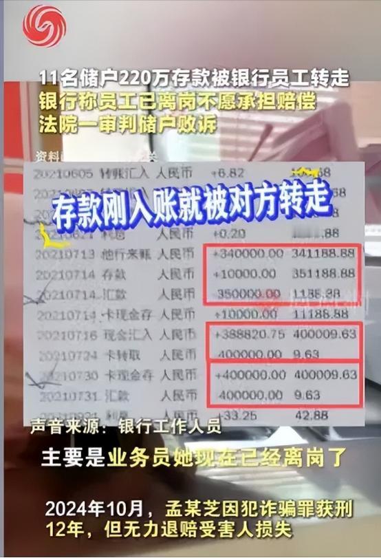 “太荒唐了!”内蒙古呼伦贝尔,女子去存75万元,是在窗口办理的,在不知情的情况下,她的钱汇到了别人的卡,她的75万,被柜台里的工作人员转走了,受害人有11个,一共被转走了220多万,他们去讨个说法,却被告知这个工作人员已经离岗了,女子去起诉,让女子意想不到的事情发生了。 “难道银行员工犯罪离职,银行就不用承担任何责任吗?”法庭上,朱女士的声音因为愤怒而微微发颤,她手里还紧攥着一叠泛黄的存款单据。 可这些本该作为凭证的单据,如今却如同一堆废纸,而那些她辛辛苦苦攒下的75万元、本来打算给孩子买房用的钱,竟然在存进银行后,说没就没了! 然而更令人震惊的是,这些钱并非系统故障、也不是朱女士操作失误,而是被柜台里那个身穿制服、佩戴工牌的正式银行员工,偷偷转到了自己的账户。 这一切,都让朱女士觉得荒唐、可怕:“那可是银行啊,是老百姓最信任的地方!可现在他们一句员工已离职,就想把自己摘得一清二净,天底下还有没有王法了!” 事情还要从2021年7月说起,朱女士将自己攒下的75万元积蓄拿到银行网点办理存款:排队、叫号,把现金从窗口交给工作人员;对方动作麻利:点钞、打印回执、盖章,一切看起来再正常不过。 可几个月后朱女士偶然发现,她的账户余额竟然清零了。直到这时,朱女士依然没有太过担心,她以为自己有凭证、银行也有监控和记录,75万总不至于不翼而飞,充其量可能就是系统错误,只要去银行说清楚就行。 可让朱女士没想到的是,这笔钱压根没进银行系统,而是通过内部操作直接进了那个柜员的私人卡里。 这是何等胆大包天!那位柜员竟然敢在众目睽睽、监控全方位覆盖的情况下,堂而皇之的偷钱,这种事要不是亲身经历,朱女士怎么也不敢相信。 后来警方调查发现,这名员工竟然不只骗了她一个人,前后共有11位储户受害,总金额超过220万元。 更残酷的事实是,虽然涉事员工很快被抓,因诈骗被判了12年,但那些被挪用的巨款早就挥霍一空,追回的可能微乎其微。 银行方面随后抛出的立场,彻底将储户推向了冰冷的两难境地:他们认为,这是员工利用职务便利实施的个人犯罪行为,银行本身也是“受害者”;而且现在该员工已经离职,银行不应为此承担民事赔偿责任。 这样的说辞无疑是把朱女士在内的11名受害者推向绝望的深渊。于是,11位储户不再沉默,将银行告上法庭。 然而,法院的判决再次给了他们一个沉重一击。一审败诉后,受害者愤怒的说:“如果连银行都不安全,我们还能相信什么?” 好在事情并未就此终结,2026年1月5日,呼伦贝尔市中级人民法院二审此案。储户的律师在法庭上据理力争:员工虽然离职,但这也证明银行在内部监控、岗位制约、异常交易实时风控等方面存在明显漏洞。 正是这些管理失守,才让“黑手”一次次轻易得逞! 如今,11个家庭仍在焦虑中等待二审的法槌落下。无论最终判决如何,此案都已在他们的人生中刻下了难以磨灭的印记。 最后,希望法律能在惩处个体的罪恶之后,也能抚平制度的伤痕,让这份判决不仅终结一场官司,更能守护住千万人走进银行时,那份朴素而珍贵的安心。 对此你有什么看法?欢迎在评论区留言讨论。银行管理失职 诈骗案件 信息来源: 凤凰网 文|墨海 编辑|史叔