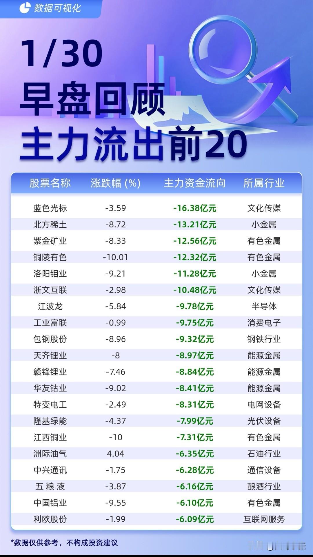 1月30日早盘,A股主力资金呈现显著的板块分化特征: 1. 流入端:通信设备板块成为核心吸金方向,天孚通信(11.07亿)、新易盛(9.27亿)、航天发展(8.64亿)等个股获大额资金净流入,板块内多股涨幅居前;电池、工程建设等板块亦有资金布局。 2. 流出端:文化传媒、有色金属板块遭主力资金集中抛售,蓝色光标(-16.38亿)、北方稀土(-13.21亿)、紫金矿业(-12.56亿)等流出规模居前,能源金属、光伏设备等板块同步承压。 整体来看,资金从周期、传媒等板块向科技(通信设备)板块迁移,市场风格偏向成长,后续需关注通信设备板块的持续性及资金回流信号。