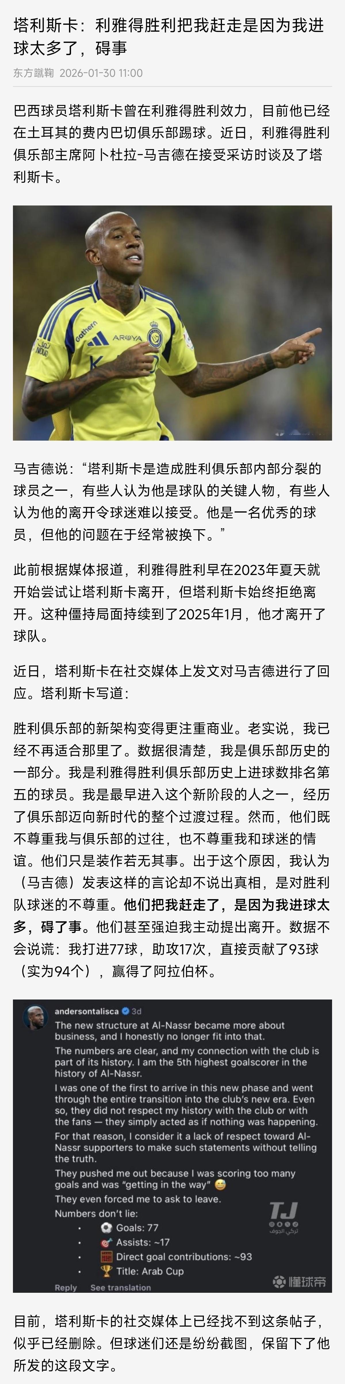 塔利斯卡:利雅得胜利把我赶走是因为我进球太多了,碍事