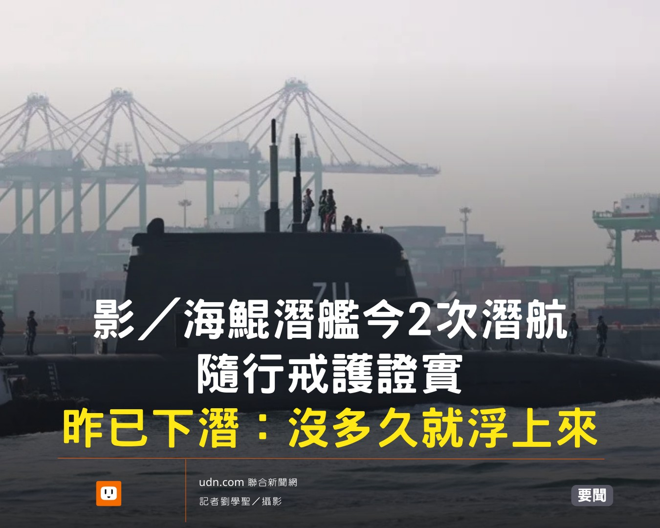 中国台湾“海鲲”号潜艇昨天下潜50米,完成声纳、动力和水下计程仪等3大项测试,护卫人员也证实,昨天「确实曾看到海鲲舰下潜,但没多久就浮上来」,今天再次出海,可能往下潜100米测试。