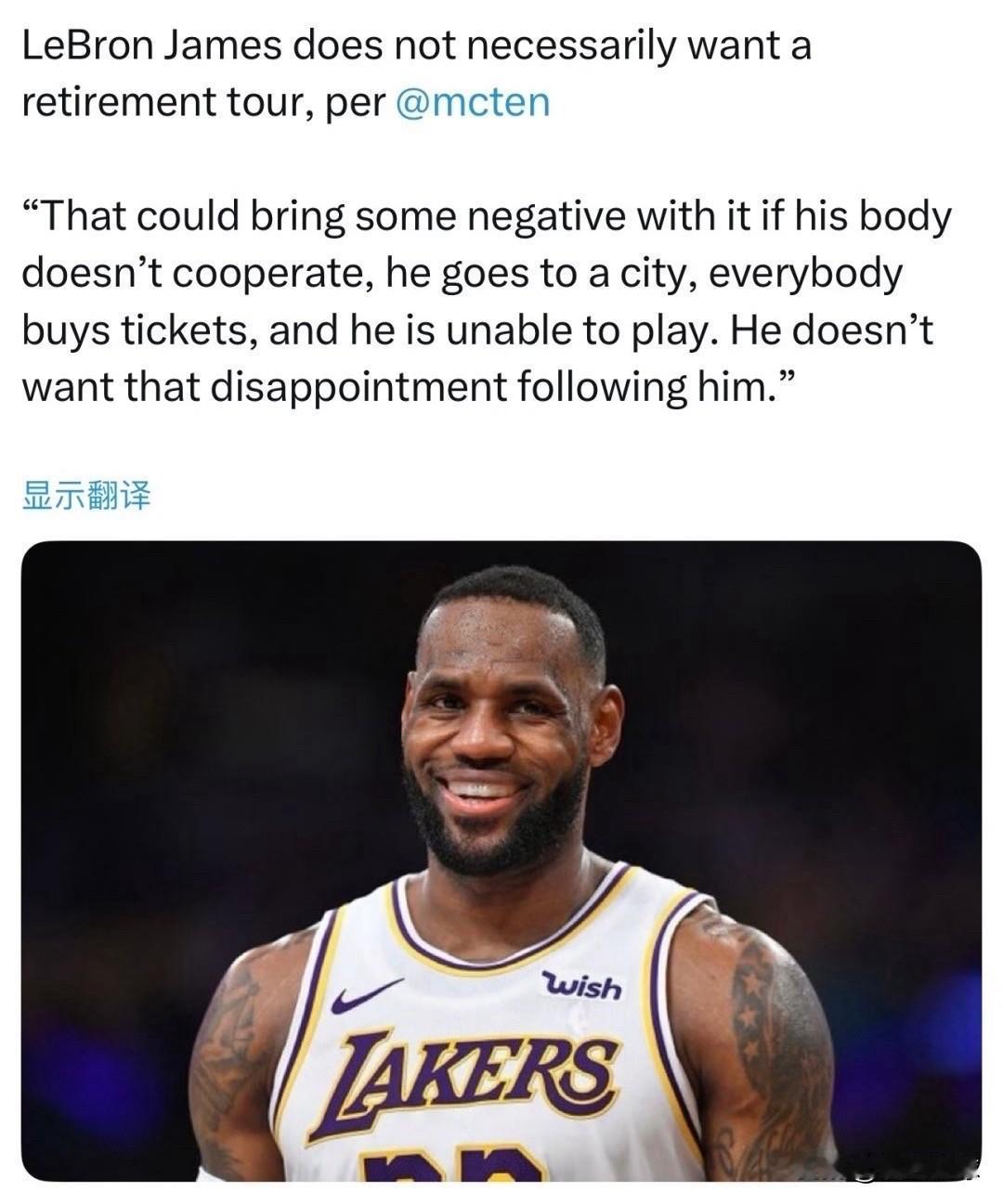 湖人记者Dave: “詹姆斯未必想要办退役巡演。如果他的身体状态不配合,去到一个城市,所有人都买了票,他却打不了,那可能会带来一些负面的影响,他不想让那种失望一直跟着自己。”