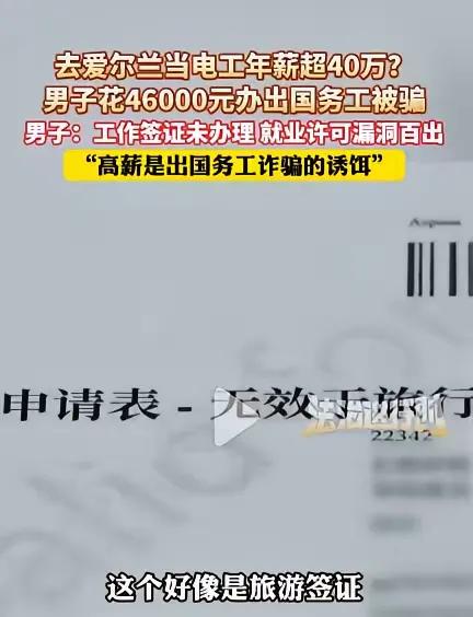 “肠子都悔青了!”北京,男子花45000元中介费,去爱尔兰当电工,年薪超40万,每天干8个小时,周薪1258欧元,可签订合同后傻眼了,因为现实和承诺的内容完全不符! 这位杜先生就是视频里的当事人,2025年的时候,他被中介画的大饼勾得心动。每天8小时、周薪上千欧元、年薪40万,听着就像天上掉馅饼。他咬咬牙拿出45000块中介费,想着出国干几年就能把家底翻番,结果签完合同才发现,中介连正经的工作签证都没办下来,所谓的就业许可更是漏洞百出。 中介嘴里的“合法务工”,到了实际操作里全是糊弄。说好了对接爱尔兰当地的正规工程队,最后只给了个模糊的地址。承诺的“雇主担保签证”,连个官方文件影子都没有。杜先生这才反应过来,自己从一开始就掉进了圈套。那些诱人的薪资数字,全是骗子用来钓鱼的饵。 其实这类骗局早就不是新鲜事。骗子专门盯着想靠出国打工翻身的普通人,用“高薪”“轻松”“包吃包住”这些字眼勾人上钩。等你交了几万块中介费,要么给你办个旅游签证蒙混过关,要么直接失联。真到了国外,没合法身份只能打黑工,赚的钱还不够交房租,想回国都没门路。 杜先生的遭遇里,最让人窝火的是中介的明目张胆。他们算准了打工者不懂国外签证政策,也耗不起跨国维权的精力。你想着赚钱,他们想着掏空你的钱包。45000块对普通家庭来说不是小数目,可能是夫妻俩攒了好几年的积蓄,就这么打了水漂。 这事也给所有人提了个醒。凡是承诺“无门槛拿高薪”的出国劳务,多半是陷阱。别被“年薪几十万”冲昏头,天上不会掉馅饼,掉下来的往往是铁饼。 各位读者你们怎么看?欢迎在评论区讨论。