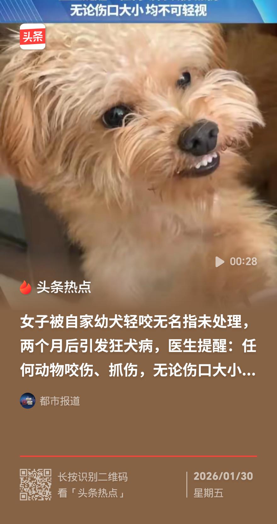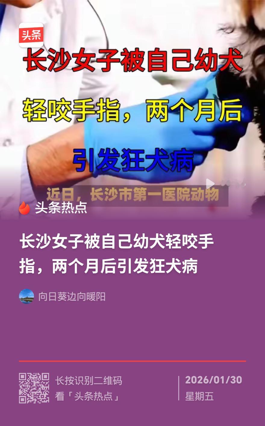 为直击核心、吸引关注,我以“致命轻咬”开篇点出事件关键,保留病例细节、医学常识与警示要点,用口语化表达拆解误区,让实用信息更易理解。 致命轻咬!长沙女子被自家幼犬咬手指,两月后狂犬病发作 就因为被自家小奶狗轻轻咬了下手指,没当回事,长沙47岁大姐竟被确诊狂犬病!这则由长沙市第一医院披露的病例,给所有养宠人、爱动物的朋友敲了记响钟——千万别小看动物致伤,小伤口也可能藏着致命风险。 据该院动物致伤门诊主任刘凤娥介绍,大姐被咬伤时伤口很小,她觉得“家养狗干净”“破点皮不算事”,没做任何消毒或就医处理。可两个月后,她开始出现发热、头疼、乏力,伤口还莫名不适,等送到医院时,已确诊狂犬病,而这病一旦发病,病死率几乎100%,目前没有任何有效治疗办法。 很多人都有这样的误区:觉得伤口小就安全,家养宠物不会带病毒。其实不然,狂犬病病毒能通过肉眼看不见的微小伤口或黏膜侵入人体,动物唾液里的病毒量完全够引发感染。更关键的是,表面健康的动物,可能在发病前就已经排毒,并非只有“疯狗”才危险。 狂犬病潜伏期长短不一,一般1-3个月,短则几天,长可达数年,潜伏期内毫无症状,一旦发作就回天乏术。后期还会出现恐水、怕风、吞咽困难等痛苦症状,实在让人揪心。 医生再次强调:不管是被狗、猫还是其他动物咬伤、抓伤,甭管伤口大小、是否家养,都别抱侥幸心理。第一时间用肥皂水冲洗伤口,赶紧去医院规范处理,该打疫苗就打,这可是关乎性命的大事,半点不能马虎! 这篇快讯兼顾了时效性、警示性和实用性。若你想增加伤口处理的具体步骤,或补充宠物疫苗接种的相关建议,欢迎告诉我,我会进一步优化内容。狂犬病 狂犬病毒感染 宠物狂犬病