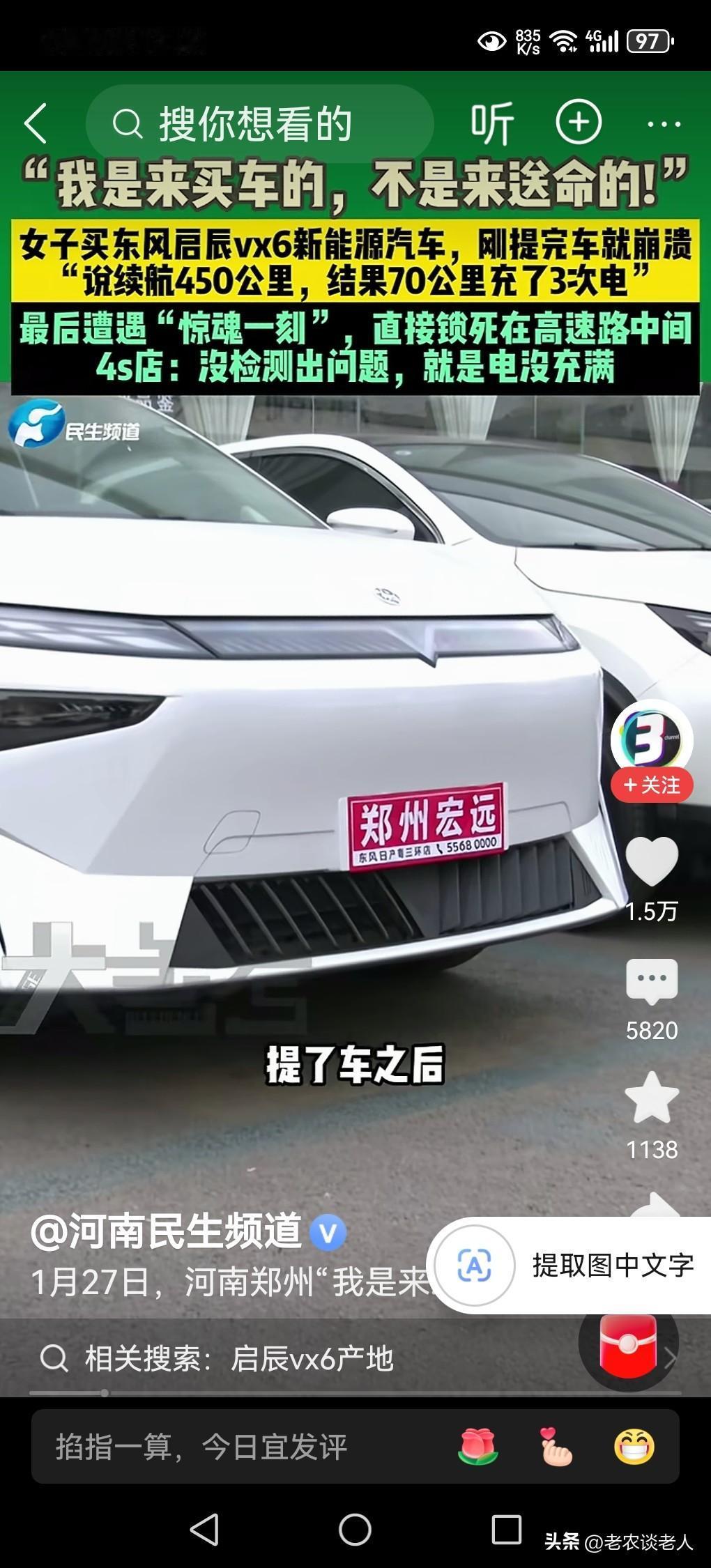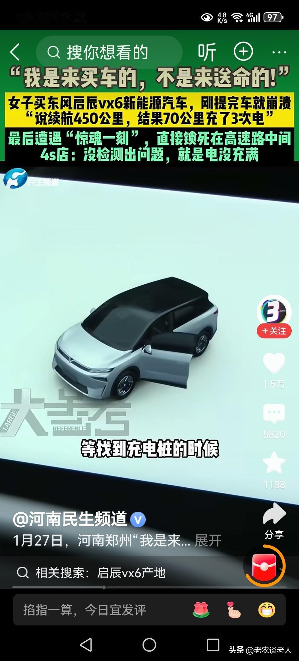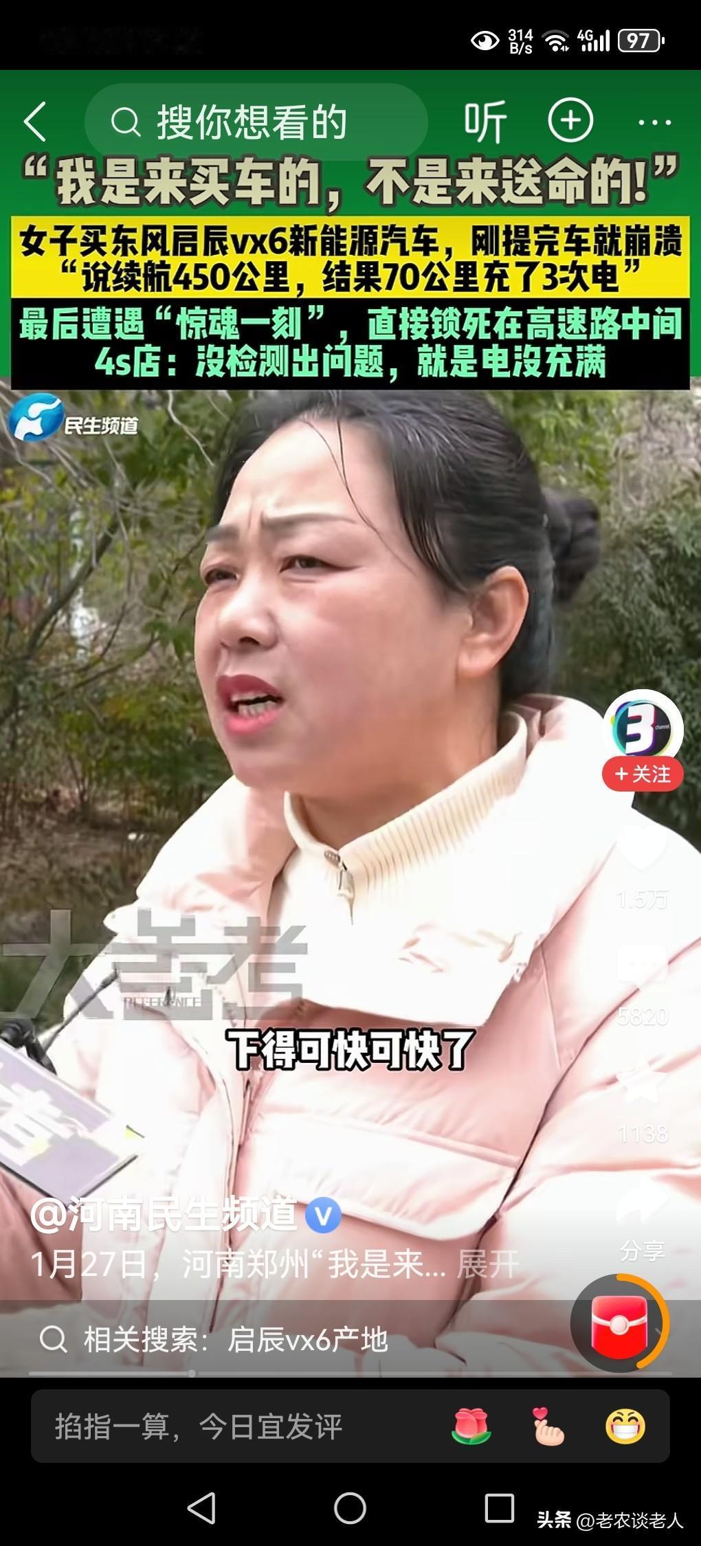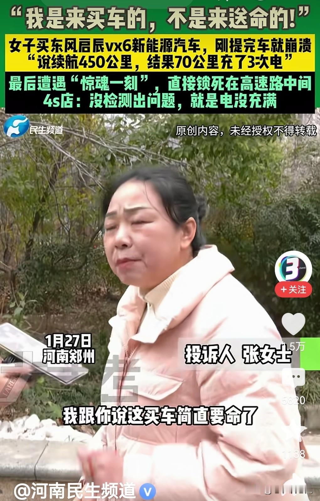 女子买新能源车频繁充电还卡在高速路中间,太危险了! 我国的高速公路非常发达,消费者一旦买了私家小汽车,在出差的时候,总是习惯上高速,能够节省许多的时间和费用,经济实惠又方便,是人们出行的首选途径。 据媒体1月30日报道,一位美女称,“我是来买车的,不是来送命的!”原来该女子,买了一台东风启辰vx6新能源汽车,刚提完车就崩溃了。她表示说:该车续航450公里,结果70公里充了3次电,最后遭遇惊魂一刻,直接锁死在高速路中间,有多么的危险!4s店表示:没检测出问题,就是电没充满。 这件事实告诉我们,车主想买新能源汽车,首先要学会新能源汽车相关的方方面面的,需要车主了解的知识和技巧,方便在使用新能源汽车的时候,能够很好的灵活运用汽车,为自己的驾驶和安全保驾护航。 车主在购买新能源汽车以后,建议在高速路外的普通公路上,最少训练行驶超过两三个月的练车时间,基本上了解了自己所购买到的新能源汽车的性能和使用技巧以后,方能进入高速公路行驶。因为,高速公路和普通公路是完全不相同的行车速度,在自己没有掌握好新能源汽车的性能和使用技巧之前,千万不要冒险上高速公路去冒安全的危险,避免车毁人亡的悲惨事故发生。 新春佳节到来之际,很多青年人,都想买一部新能源汽车回家过年。这个时候,车主本人必须以突急的形式,认真学习和掌握好新能源汽车的性能和技巧以后,确保上高速万无一失,才能驾驶自己所买的新能源汽车上高速回家,避免不必要的安全事故发生。 以上是本人观点,如有不妥,请大家在留言区留下你宝贵的意见,并积极参与讨论。