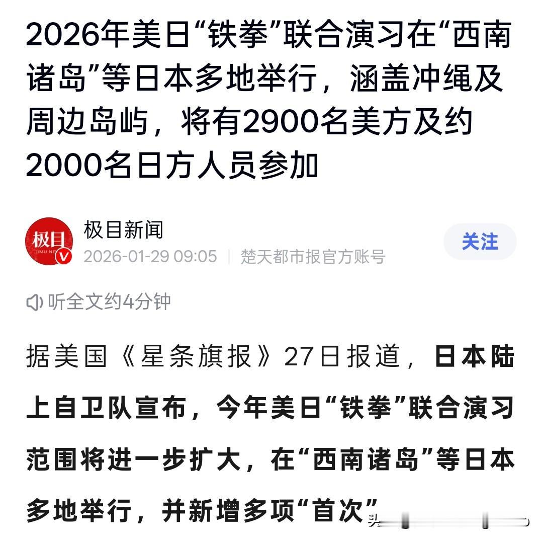 春节西太平洋“掰腕子”:美日亮出多个“首次”,我们前出到了前哨 就在大家忙着过年的时候,西太平洋上,一场没有硝烟的“掰腕子”已经开始了。 解放军舰队前脚刚于27号穿过了宫古海峡,美日联军后脚就拉开了“铁拳”军演的架势,时间横跨整个春节。这可不是什么巧合,这是双方在无声地告诉对方:这个年,我们都“准备”好了。 美日这次演习,玩得挺大。新增多多个“首次”:2024年新组建的“水陆机动团”第3联队将首次参演;日本陆上自卫队的V-22“鱼鹰”倾转旋翼机将首次与美军的同型机一同起飞执行任务;同时,日方的“扫描鹰-2”侦察无人机也将首次参与演习。一连串的动作,全是冲着深化两栖作战协同、提升实战互操作性去的。 我们这边呢?052D、052C、054A加补给舰,一支“2驱1护1补”的精干编队直接前出,能在西太独立巡航大半个月不靠岸。走宫古海峡,坦坦荡荡,按《联合国海洋法公约》来。你拉开架势要练,我就提前到你跟前转一圈——不碰你,但让你改课目、调兵力,省得你太自在。 这一来一回,东盟没接话,韩国也划清界限。大家心里都清楚,西太平洋的格局正在我们眼前重塑:过去的“第一岛链”是道锁,现在,它变成我们的日常活动区。 宫古海峡,对我们而言早已不再是需要奋力突破的“出口”,它已经是我们进出自如、镇守前方的“前哨”。 那么,看到这种高强度、专业级的过招,你心里的第一感受是什么?是觉得国家有实力守护安宁的“踏实感”更强,还是对大国博弈可能升级的“紧张感”更多? 美国太平洋策略 美军太平洋演习