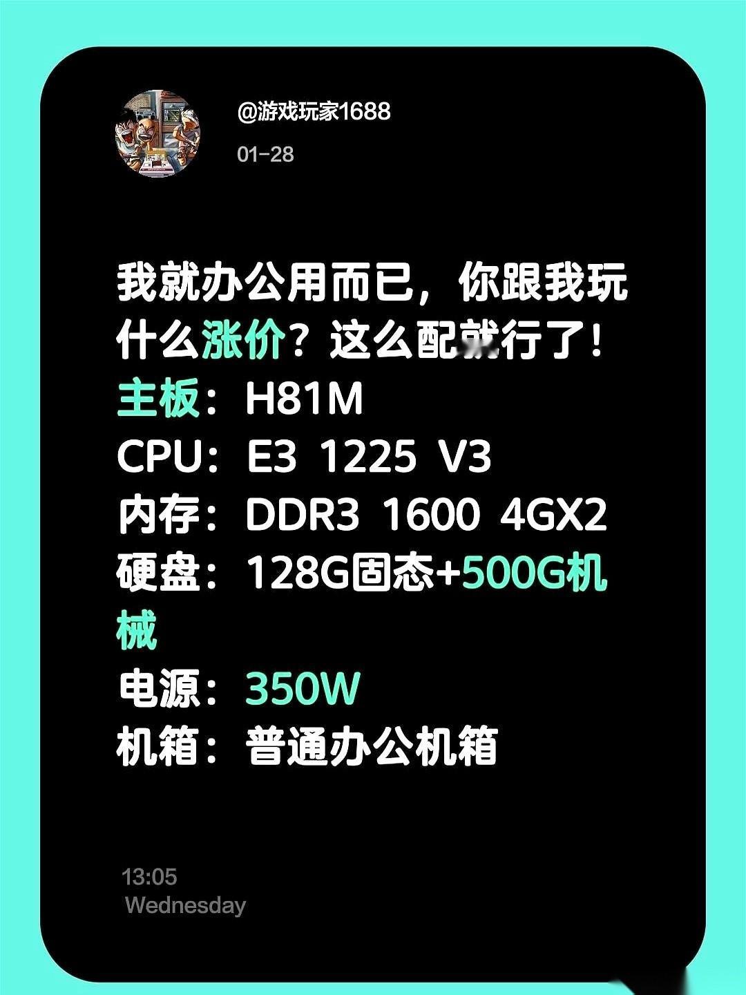 “我就办个公,你跟我玩什么涨价?” 这句话简直是灵魂拷问。 真想把这张配置单甩在那些“大神”脸上。 H81的主板,配个E3的老U。 DDR3的条子,8个G。 再来个小小的固态,开机速度秒杀全公司99%的电脑。 这就够了啊! 真的,这就够了。 我就是开个Word,做几张PPT,偶尔用PS抠个图。 你跟我扯什么最新架构?跟我谈什么AI加速? 我的表格是需要光线追踪了,还是我的邮件需要8K分辨率了? 清醒一点。 工具是为人服务的。够用,好用,不出毛病,就是王道。 别被那些消费主义的鬼话给绕进去了。 什么“性能过剩是为未来投资”…… 我呸。 省下来的钱,给自己加个鸡腿,给娃买个玩具,晚上早点下班回家陪陪家人,不香吗? 这套东西,现在凑齐了,可能就几顿饭钱。 但它能勤勤恳恳,安安静静,再陪你战五年。 这,才叫性价比。 这,才叫活得明白。