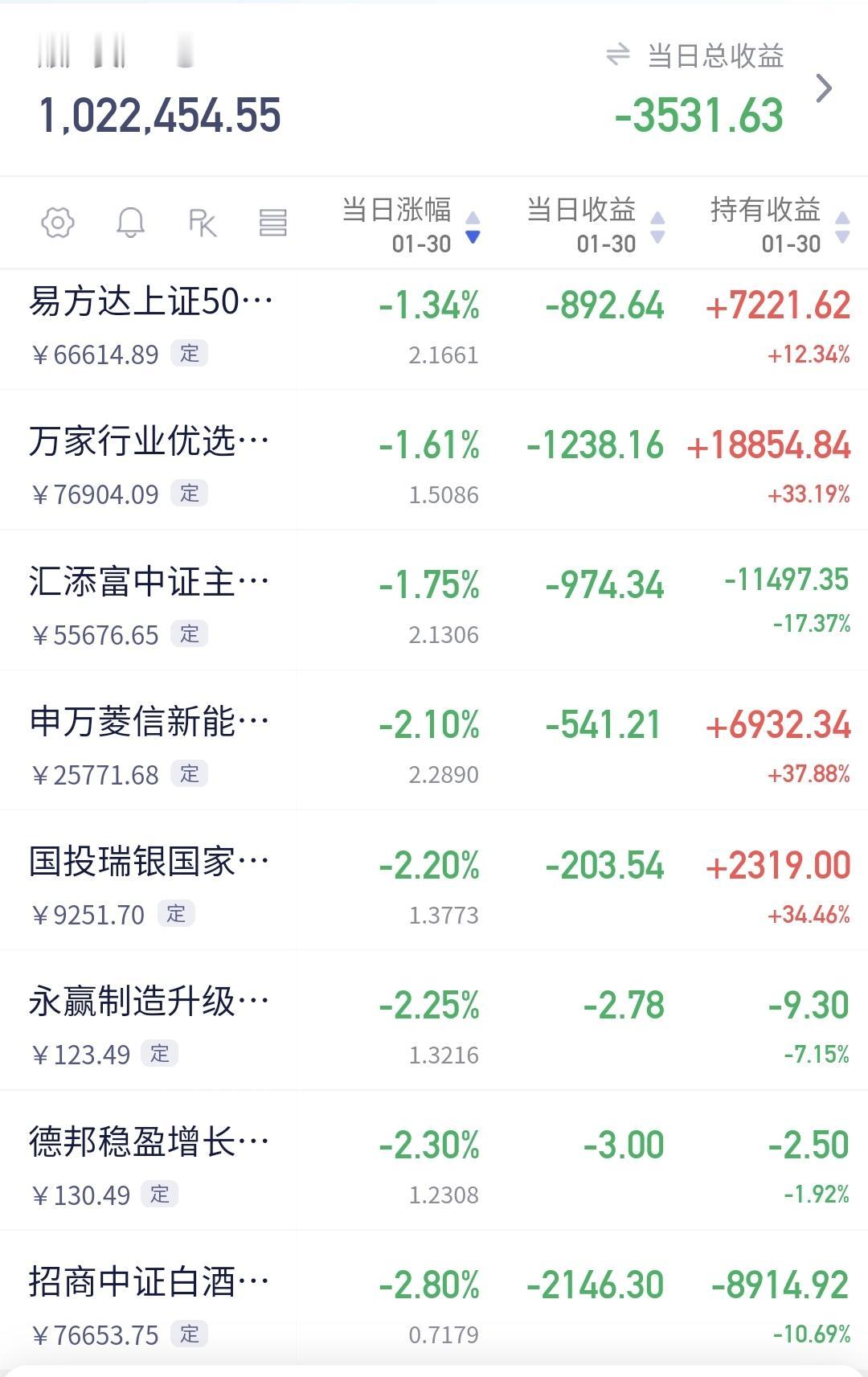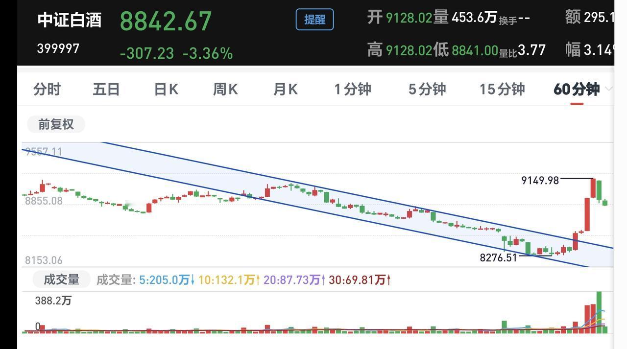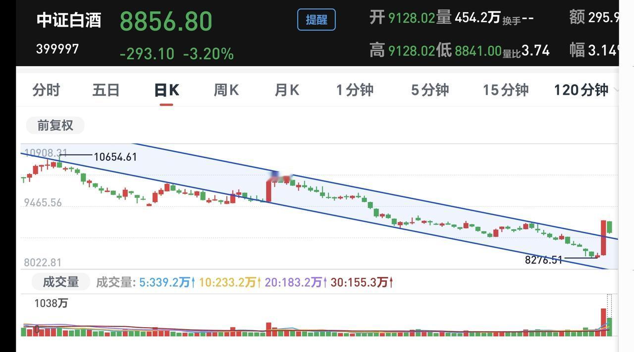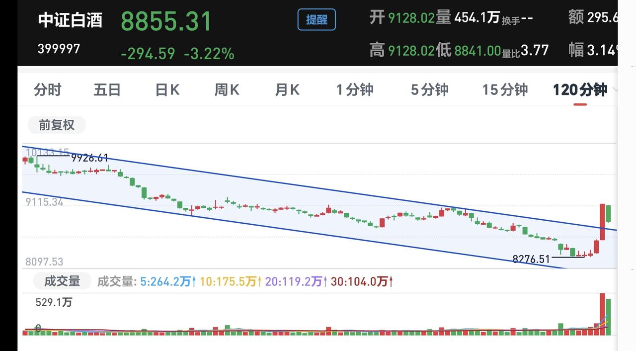 基金:白酒板块应该怎么办 市场指数现在探底回升中,创业板指已经翻红,上涨了0.45%,盘中点位3319点,上证指数下跌了1.39%,盘中点位4100点。 现在黄色线还是在蓝色线上方,但两条线之间的敞口已经缩小,注意观察黄色线能不能重新高高在上,黄色线会不会下穿蓝色线,这是关系到今天能不能继续反弹的主要因素。 现在两市累计成交17731亿,相比于昨天缩量了2%,说明在刚才的反弹过程当中是有资金进场的,开盘以后的一段时间缩量幅度达到了7%,只要有资金进场,今天大跌的可能性就不大。 市场上涨1200多家,下跌4000多家,下跌家数远远超过了上涨家数,涨停23家,跌停54家,跌停家数也超过了涨停家数,主力资金净流出956亿,已经接近了1000亿。 持有的基金中,估值上涨幅度最大的三个板块是:创新药板块,5G板块,芯片,半导体板块,下跌幅度最大的三个板块是:白酒板块,可控核聚变板块,AI应用板块,估值整体亏损了3531元。 持有的白酒板块基金昨天大涨,今天现在盘中估值下跌了2.80%,继续观察会不会下跌幅度超过3%,只要下跌幅度在3%以内,就是正常的震荡调整。 看下面的截图7,这是白酒板块60分钟K线图,昨天上涨突破了60分钟级别下跌通道的上轨线,今天回落并没有重新来到下跌通道内,是不是有效突破还需要继续观察。 看下面的截图8,这是白酒板块120分钟K线图,昨天上涨也突破了这个级别上涨通道的上轨线,今天的回落来到了下跌通道上轨线附近,现在的情况之下不能继续下跌,如果继续下跌,又会回到下跌通道内,也就说明昨天的突破是假突破。 看下面的截图9,这是白酒板块日K线图,昨天上涨也突破了日线级别短期下跌通道的上轨线,今天震荡调整又来到了下跌通道上轨线附近,跟120分钟级别判断是一样的,这个地方也是不能继续下跌,如果继续下跌也会重新回到日线级别短期下跌通道内,如果真的是这样,昨天的突破就是一个假突破。 白酒板块昨天大涨,今天主要观察震荡回落的幅度,3%之内的震荡回落都是正常的,如果震荡回落超过3%以上,甚至是重新回到下跌通道内,那昨天的突破就是假突破,白酒板块所有级别就还是处于下跌趋势中,白酒板块的反弹就还需要耐心等待。 玩基金是一件长期的事情,玩白酒板块是需要耐心的,长期下跌以后的板块,不可能在一夜之间反转,即使有反转的可能性也是很小,这个时候我们需要保持耐心,在有底仓的基础上,坚持定投就可以了。我反正是每天定投200块钱,就这样慢慢跟它玩着,就这样慢慢捞着底部区域的筹码,将来真正上涨的时候,你手中的筹码也足够了,那个时候的上涨才是更好的,不要盼望它上涨,不要盼望它反转,上涨真正来的时候,你是挡也挡不住的,上涨还没有到来的时候,你是拖也拖不来的。 花一秒钟点赞,花30秒钟评论,就是对我最大的支持,谢谢大家的支持。