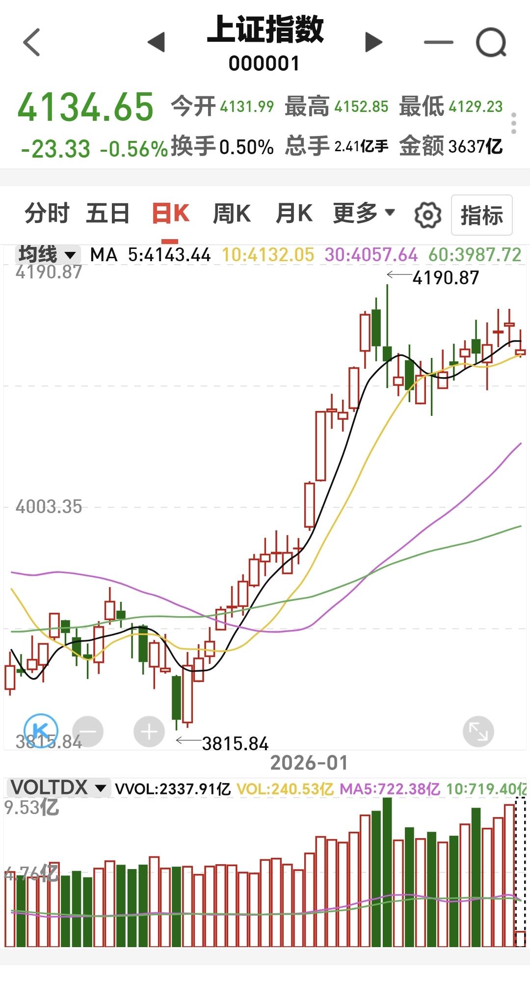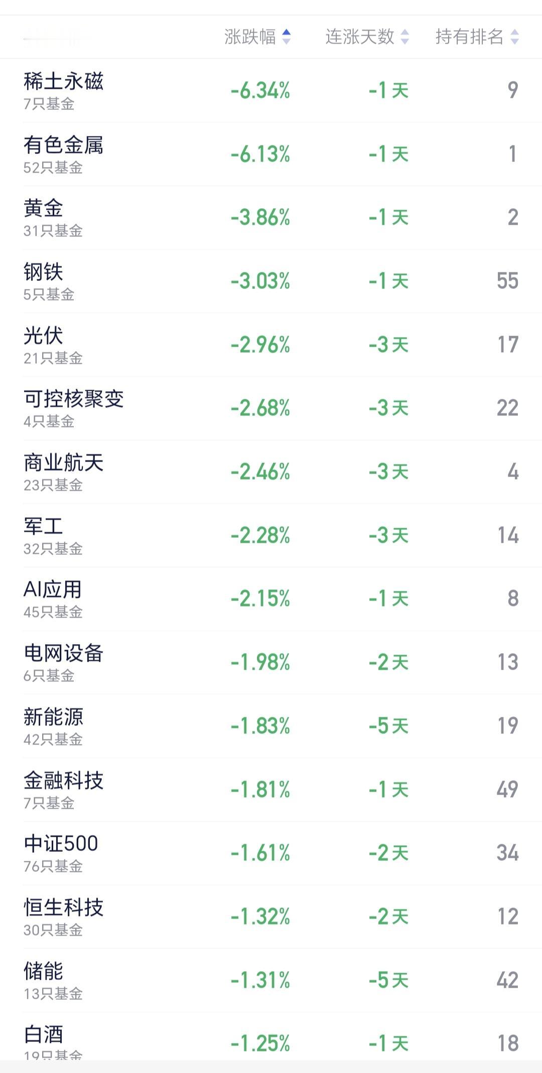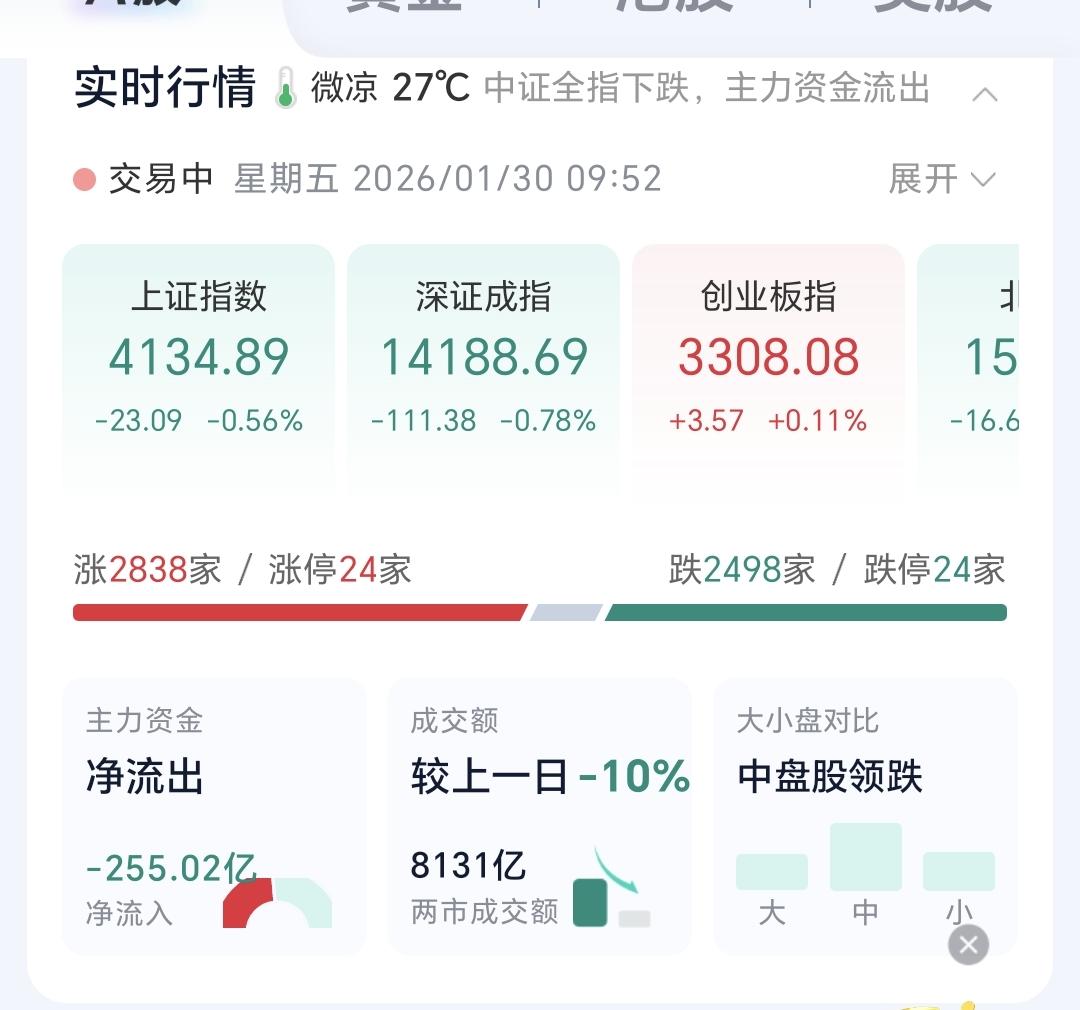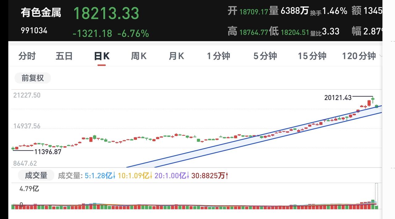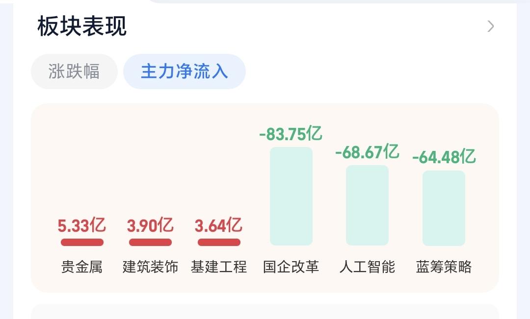 基金:有色金属板块应该怎么办 今天市场低开,三大指数都是低开,创业板指开盘下跌了0.09%,开于3301点,上证指数开盘下跌了0.63%,开于4131点。 开盘以后指数小幅度震荡向上,现在黄色线在蓝色线上方,两条线之间的敞口比较大,只要黄色线能够保持在高高在上,今天翻红的可能性并不是没有。 两市累计成交8131亿,相比于昨天同期缩量了10%,这是一个不好的现象,说明在反弹的过程当中没有资金进场,说明今天即使有反弹,幅度也不会很大,今天大概率就是一个震荡的走势,小涨和小跌都是很正常。 市场上涨2800多家,下跌2400多家,上涨家数超过了下跌家数,涨停24家,跌停也是24家,跌停家数有点多,主力资金净流出255亿,刚刚开盘就净流出这么多的资金,更加说明了今天大幅度上涨的难度很大。 看下面的截图6,这是主力资金进出板块的情况,主力资金净流入最多的三个板块是:贵金属板块,建筑装饰板块,基建工程板块,主力资金净流出最多的三个板块是:国企板块,人工智能板块,蓝筹策略板块。 持有的基金中,估值上涨幅度最大的三个板块是:创新药板块,兴全合宜,芯片半导体板块,下跌幅度最大的三个板块是:军工板块,可控核聚变板块,AI应用板块,估值整体亏损了3161元。 看下面的截图9,今天下跌幅度最大的三个板块是:稀土永磁板块,有色金属板块,黄金板块,稀土永磁板块现在盘中估值下跌了6.34%,这个板块的持有人数在所有板块当中排名第9位,说明里面的散户也是比较多的。 看下面的截图10,这是有色金属板块日K线图,今天的下跌又回到了日线级别短期上涨通道内,短线持有的人,观察会不会跌破这个短期上涨通道的下轨线,这个短期上涨通道的下轨线,就是短线持有者的持有条件。 看下面的截图11,这是有色金属板块周K线图,前段时间上涨突破了这个上涨通道的上轨线,进入了加速上涨走势,今天的下跌还是处于这个上涨通道的上方,并没有改变周线级别的上涨趋势,长线持有的人可以继去持有,周线级别上涨通道的下轨线,就是长线持有者的持有条件。 现在许多人应该理解了人多的地方不去,热闹的地方不去,我们不可以去追涨,我们只要持有自己手中的就可以了,追涨只是图一时快乐,这就像去外面吃快餐,虽然会让你获得短暂的快乐,但在让你支付598的时候,你心里面还是会有点不舒服。 花一秒钟点赞,花30秒钟评论是对我最大的支持,谢谢大家的支持。