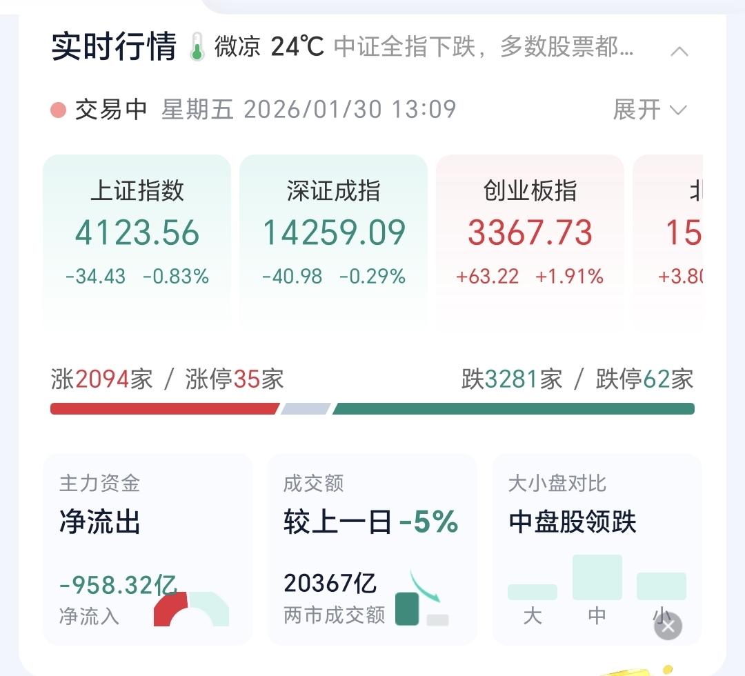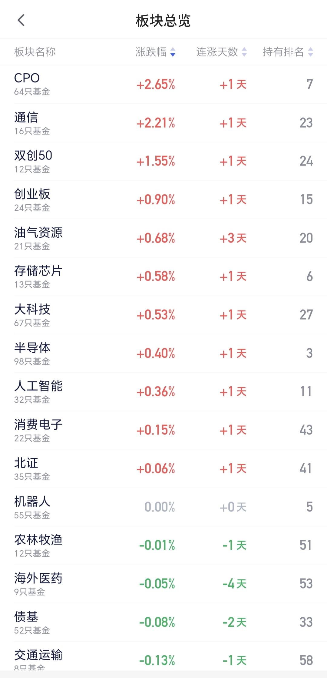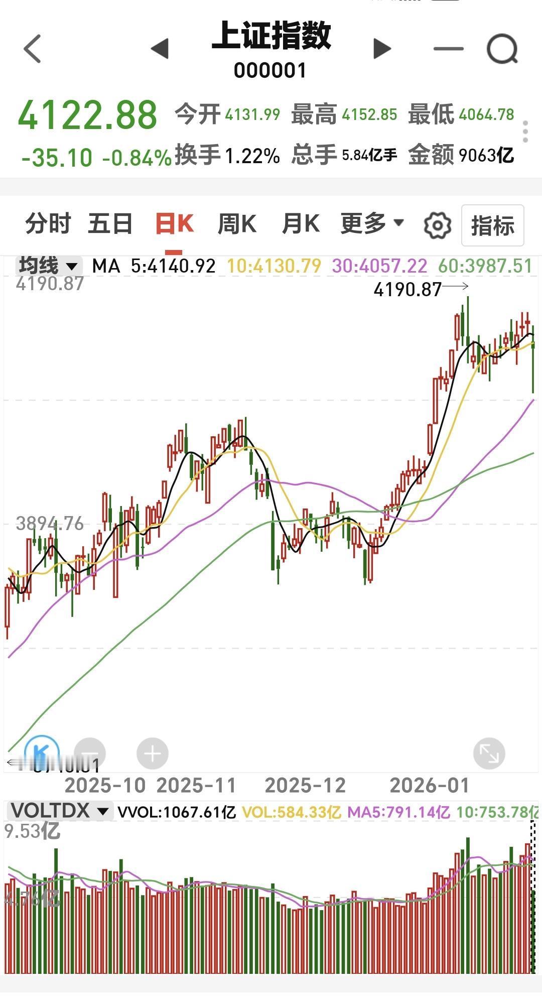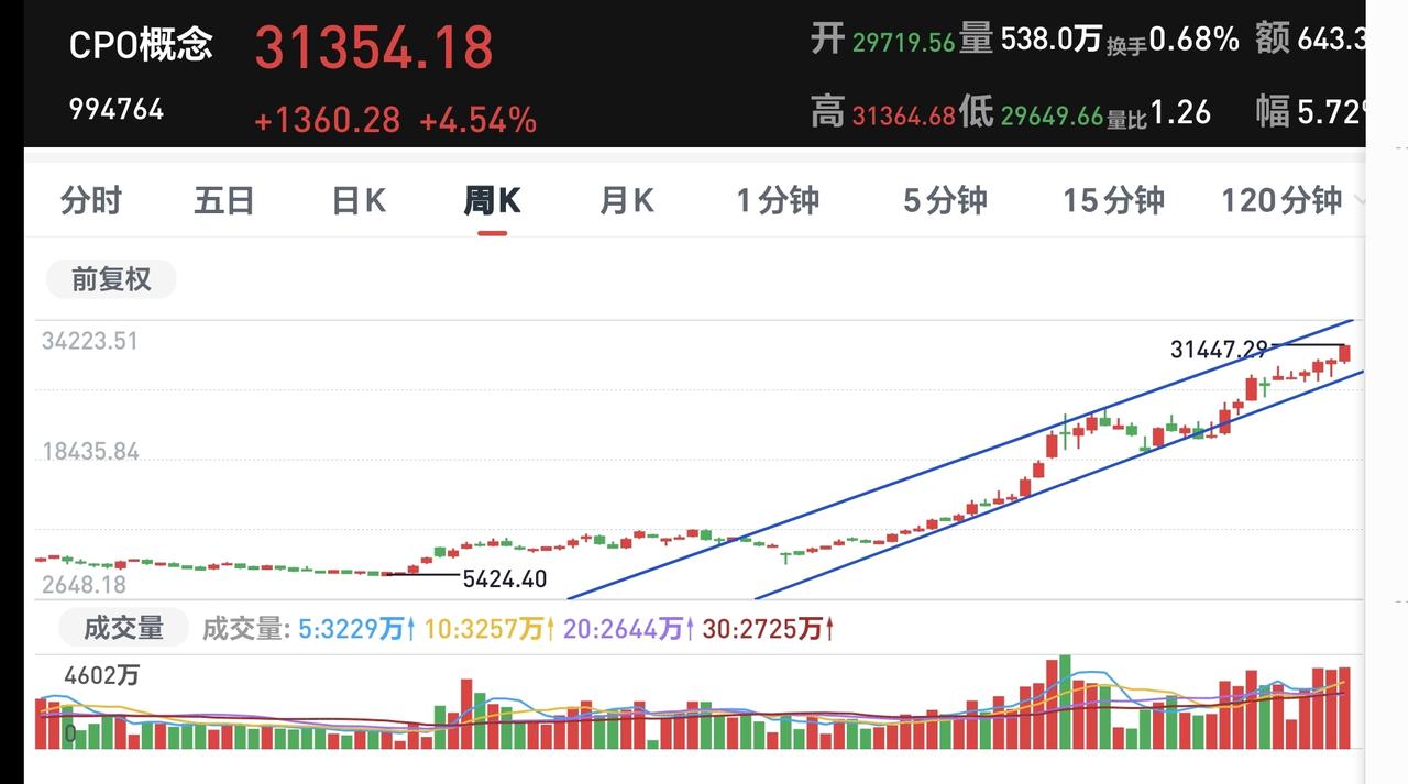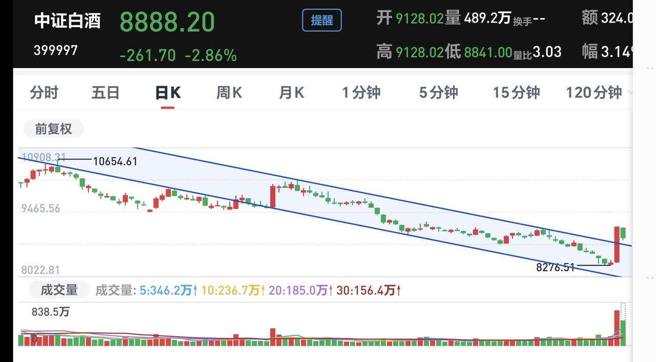 基金:白酒板块有一个不好的现象 下午开盘以后,指数震荡向上,创业板指大涨了1.82%,盘中点位3364点,上证指数下跌了0.89%,盘中点位4120点。 现在五天线位置是4140点,盘中点位4122点,是在五天线之下的震荡,收盘之前观察能不能站上五天线,五天线之下的震荡都不能说明市场已经好转。 现在两市累计成交20367亿,相比于昨天同期数量了5%,说明在下午反弹的过程当中并没有资金进场,看下面的截图5,这是主力资金动向图,今天开盘以后主力资金大幅度净流出,11点钟左右开始静止不动,既没有大幅度净流入,也没有大幅度净流出,说明现在盘中的反弹,对于主力资金来说是不认可的,不然的话,他们会随着指数的上涨,跟随净流入。 现在市场上涨幅度最大的板块是CPO,这个板块的持有人数在所有板块当中排名第七位,散户人数也是不少。 看下面的截图8,这是cpo板块日K线图,今天上涨突破了日线级别上涨通道的上轨线,这样的情况之下可以继续持有,但不可以追涨进场。 看下面的截图9,这是cpo板块周K线图,现在的位置处于这个上涨通道内,长线持有的人可以继续持有,周线级别上涨通道的下轨线,是长线持有者的持有条件。 Cpo板块短线进场需要谨慎,持有的人可以继续持有,短线进场并不是不会涨,只是短线进场的性价比已经不高,上涨通道上轨线附近都是不建议进场的。 持有的基金中,估值上涨幅度最大的三个板块是:5G板块,芯片半导体板块,创业板指,下跌幅度最大的三个板块是:白酒板块,AI应用板块,大消费板块,估值整体上涨了4343元。 持有的基金中,现在盘中估值下跌幅度最大的是白酒板块,基金估值下跌了2.68%,看下面的截图12,这是白酒板块日K线图,昨天上涨突破了短期下跌通道的上轨线,今天是在回落当中,回落的幅度没有超过3%,但有一个很不好的现象,那就是今天的震荡回落过程当中是放量的,今天放量幅度的很大,说明有资金出逃,如果今天震荡回落的幅度在3%以内,成交量也是很小,那后面继续上涨的概率很大,今天成交量很大的情况下,就给后面的继续上涨增加了不确定性,今天成交量很大的情况下,需要翻红才行。 花一秒钟点赞,花30秒钟评论,就是对我最大的支持,谢谢大家的支持。