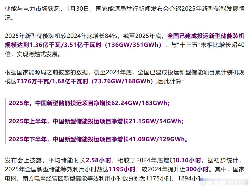 2025年下半年,中国新型储能投运项目净增长41.09GW/129GWh。