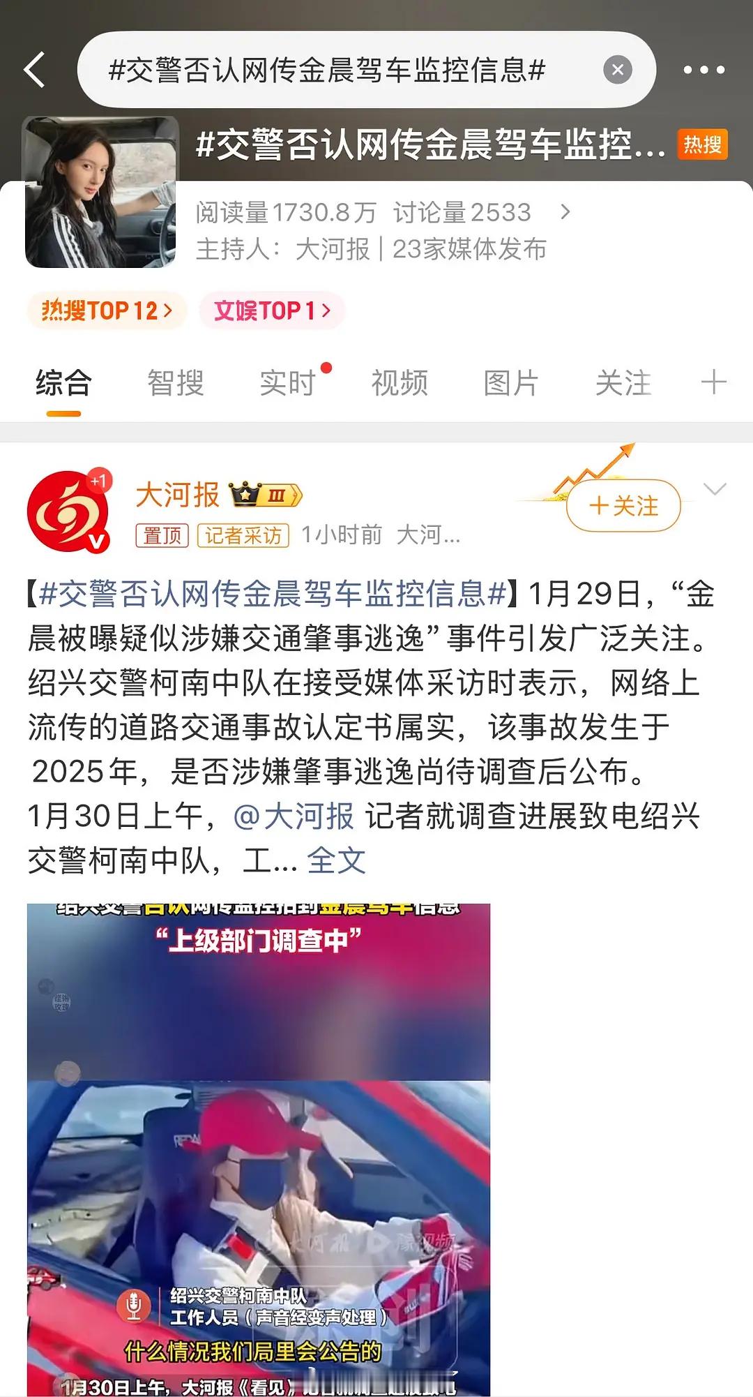 金晨肇事逃逸事情的最新进展:交警否认了网传的驾车监控信息。