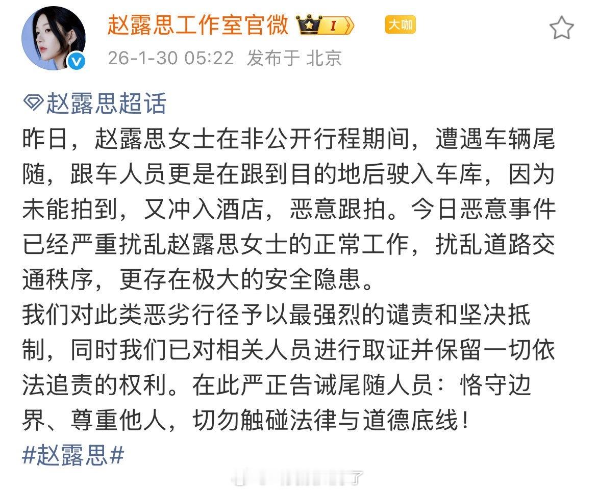赵露思工作室在维权,说昨天赵露思在非公开行程期间遭遇了车辆尾随。