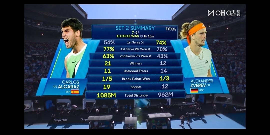 兹维列夫第二盘输掉抢七,是不是意味着他这场半决赛已经没有了? 球迷这样评价兹维列夫:怒其不幸,总是遇到德约、阿卡、辛纳打不过;哀其不争,总是差那么一点点。如果不是靠着强有力的一发吊着,这场比赛可能输的更快。 第二盘的赛后统计显示,紫薇在一发成功率高出20%的情况之下,一发得分率居然比阿卡低了7%。 现在阿卡完全可以畅想一下决赛打德约还是辛纳?分别该怎么打了!!!