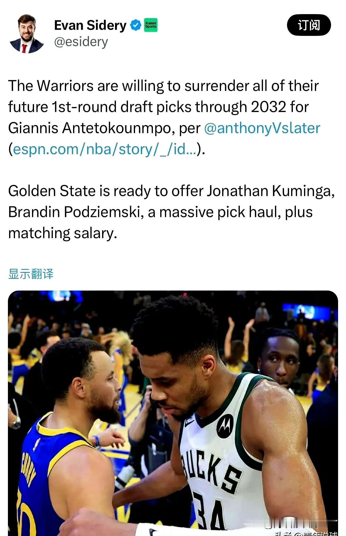 勇士为了字母哥,把能押的都押上了。 NBA名记Slater说得明白,过去一周,勇士找雄鹿的频率,比谁都勤,态度硬得像块石头。他们掏出的报价,说是“梭哈”都不为过。 巴特勒下赛季5600万的到期合同,直接摆上台面;库明加那点潜力,本是球队攥在手里的未来,现在也舍得往外送。 更狠的是,剩下的首轮签,能给的全给了;能换的互换权,一个没留。甚至放话,雄鹿手里那些没人要的垃圾合同,他们也照单全收。 这诚意,在所有追求者里,怕是找不到第二家。可这满桌子的筹码,细看之下,藏着两道坎?雄鹿那边,头一个要琢磨的就是库明加。 这年轻人是块璞玉不假,可到底能磨成什么样,谁也说不准。是能成独当一面的球星,还是就停在“有潜力”的阶段?雄鹿要是接了,等于把宝压在他的成长上。 万一打不出来,那笔交易就成了赔本买卖。再往深了想,字母哥真去了勇士,那些送出去的选秀权,价值怕是要大打折扣。 勇士战绩上去了,选秀顺位自然靠后,选来的新人成色难免打折扣。雄鹿拿着这些签,未必能换到真正顶用的人。 更关键的是字母哥自己,库里37岁了,巅峰还能维持几年?谁也没谱。字母哥要是来了,能不能趁着库里还在巅峰,再拿几个冠军? 等库里退了,勇士光靠他一个人,还能不能保持竞争力?这些问号,怕是要在他心里盘很久。勇士不是不知道这些风险,可他们太清楚,库里的巅峰尾巴,过一天少一天。 老话说“过了这村没这店”,现在不搏一把,难道看着机会溜走?多少球队熬了一辈子,都摸不到冠军奖杯。勇士就算赌输了,至少为这口气拼过,不窝囊。 巴特勒的到期合同,是为了帮雄鹿腾空间;库明加的潜力,是给雄鹿的未来打底;首轮签和互换权,是实打实的“硬通货”;接垃圾合同,更是把姿态放到底。 只要你肯放人,条件随便开。这种豁出去的架势,在联盟里真不多见。球迷看在眼里,心里五味杂陈。有人骂管理层疯了,把未来十年的家当都赌上了,有人觉得,为了库里,值! 竞技体育,不就图个热血沸腾吗?要是连拼的勇气都没有,那还看个什么劲?雄鹿那边,怕是也在掂量。字母哥留队的心思松动,他们得抓紧时间换回最划算的筹码。 勇士这堆东西,看着多,可真要拆解,未必都合心意。库明加的价值、选秀权的未来,都是要反复盘算的账。这笔交易成不成,现在还说不准。 可勇士这股子“不撞南墙不回头”的劲,已经刻进了球队的骨头里。当年他们靠“死亡五小”横空出世,靠的就是这种敢赌敢拼的狠劲。现在,他们不过是把当年的路,再走一遍。 说到底,篮球的魅力,就藏在这些未知里。勇士押上一切,是为了最后的绚烂;雄鹿权衡利弊,是为了球队的长远。不管结果如何,这桩交易本身,就足够精彩。毕竟,敢拼的故事,永远值得被记住。