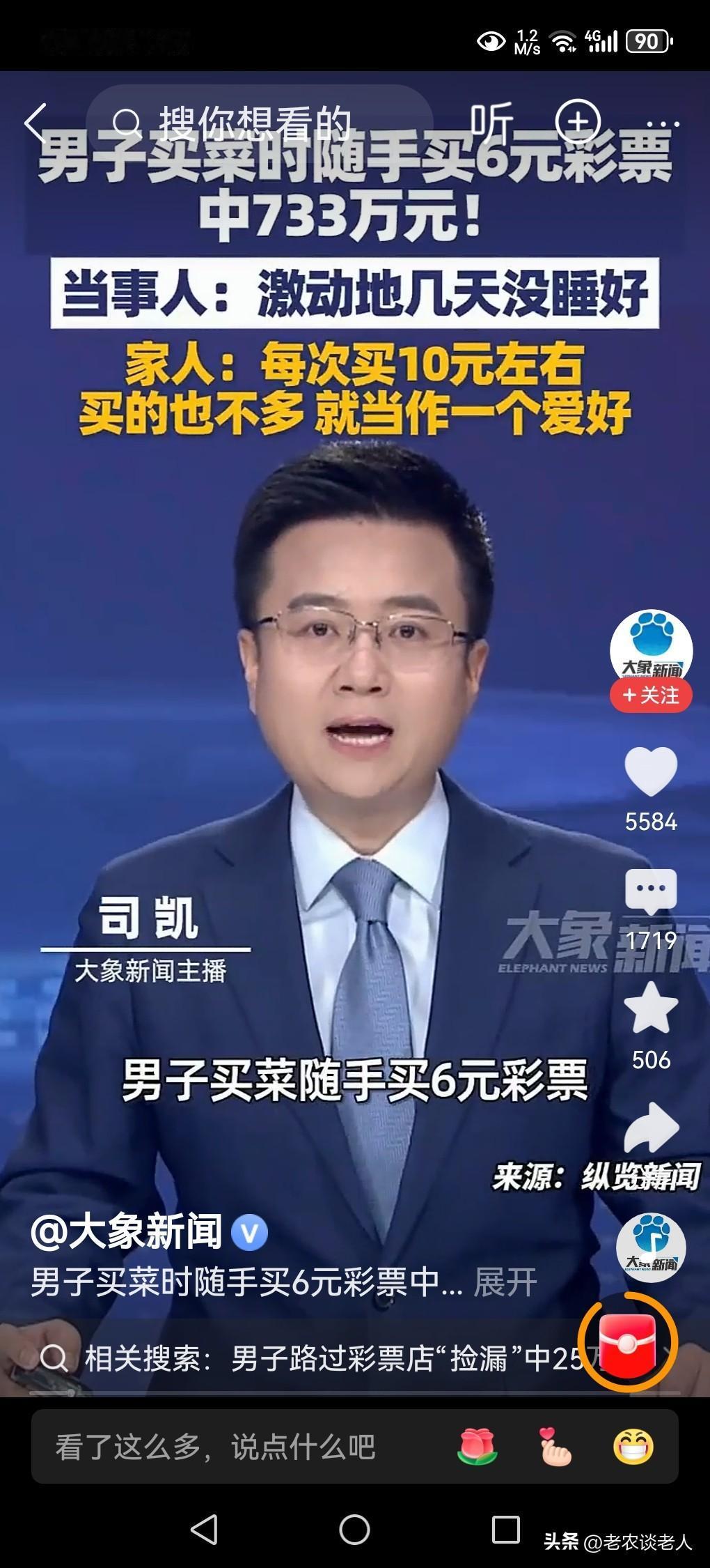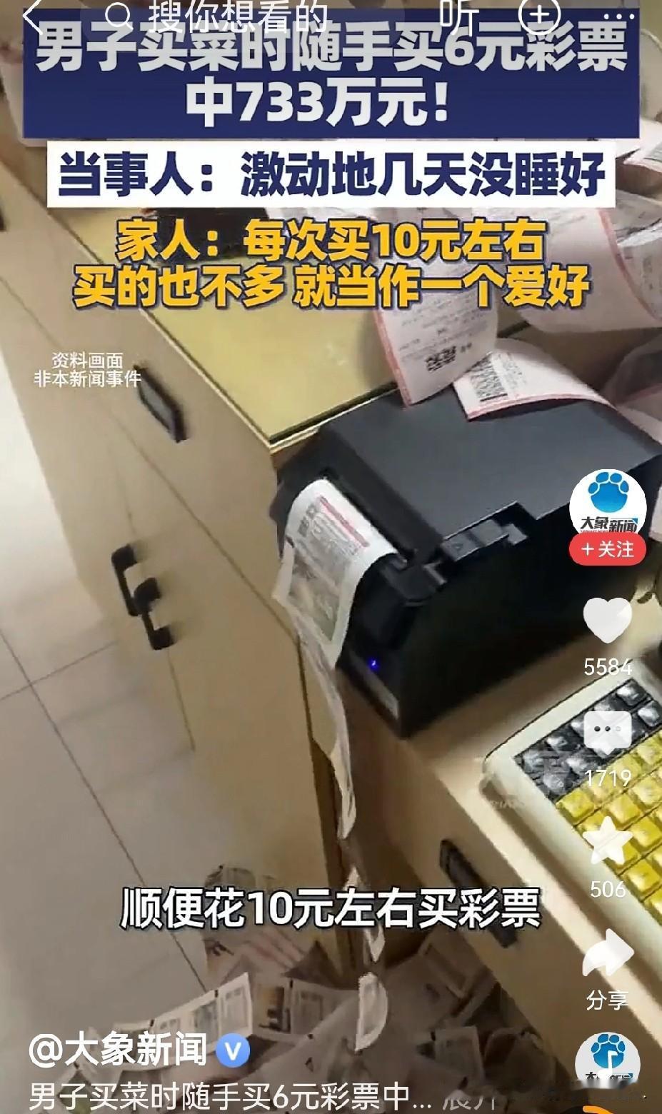 男子买菜随手买6元彩票中733万! 有很多人,在日常生活中习惯买彩票,一般分为三种,一种是以理性的买少量的彩票,来激起日常生活中乏味的情趣,作为一种生活的调料剂而为之;另一种是为了中奖而购买彩票,纯粹是为了追求能够获得更多更高额的经济回报而为之;还有一种纯粹是一颗善良的心,想为社会做一些好事为心态的一种捐献行为。 无论是哪一种行为,只要能够理性购买,不会影响到自己的日常生活和家庭经济,都是可嘉的,都是可行的,都为他们点赞,即使能够获得大奖,也是他们应该得到的,是合情合理,又合法的经济收入。 据媒体1月30日报道,一位男子在买菜的时候,随手买了6元钱的彩票竟然中了733万元的大奖,让这位男子高兴好几天都没睡好觉,他的家人表示,每次买彩票也不多,不到10元钱,只当作一种爱好而已。 本人认为这位男子是一位有爱心,乐于奉献的人,能把日常生活中,每天用少量的零花钱去买彩票,只作为生活中的一种爱好,确实是一种难能可贵的精神,确实了不起,是众人学习的榜样,如今得到了733万元的大奖,也是他劳动的所得,是他奉献的回报,是理所当然的,是无可厚非的,是合情合理又合法的,应该为他点赞,为他感到骄傲,为他感到自豪。 以上是本人观点,如有不妥,请大家在留言区去留下最宝贵的意见,便一起参加讨论。