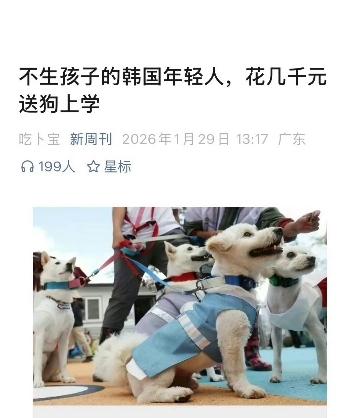 韩国当下的宠物消费市场藏着个特别鲜明的反差,人类幼儿园接二连三关门歇业,可宠物学校却开得热火朝天,不少选择不生孩子的韩国人,愿意每月花几千块,专门送家里的狗狗去宠物学校上学,甚至首尔核心城区的高端宠物园,想入学还得提前排队,这股养宠新潮流,背后藏着当地社会的真实生活状态。 这些宠物学校可不是简单帮着看顾狗狗的地方,办学的细致程度远超想象。狗狗想入学,第一步就得做专业的行为和社交测评,性格太孤僻、攻击性强的还得先上适应课,测评合格后才会按性格和年龄分班,活泼爱闹的狗狗被分到运动班,每天有充足的户外互动时间,胆小敏感的则进舒缓社交班,慢慢学习和同类、陌生人接触。课程设置也特别丰富,基础的有定点排便、规矩养成,进阶的是社会化训练,老师会模拟快递员敲门、路边车辆鸣笛这些场景,帮狗狗克服应激反应,还有的会教简单的指令和生活技能。高端的宠物学校更有花样,狗狗的SPA护理、精致造型、节日主题派对都是常规服务,甚至还有专属写真、生日纪念,把狗狗当成孩子来养的氛围拉得满满。 送狗上学的费用也分不同档次,普通的室内宠物学校主打托管和基础课程,每月一千多块就能让狗狗每周去上几天;带专业户外场地、侧重行为训练的中端学校,每月费用能到几千块;而首尔江南区那些主打高端养护的宠物园,每月学费更是上万,即便价格不低,依旧有不少宠物主人抢着报名。这些心甘情愿为狗狗教育花钱的,大多是选择不生孩子的韩国年轻人和丁克家庭,他们平时工作忙碌,白天留狗狗独自在家,不仅担心狗狗拆家,更怕狗狗长期独处产生分离焦虑,送进宠物学校,既能让狗狗有人陪伴、学些本领,自己上班也能更安心。 之所以会出现这样的现象,核心还是韩国持续走低的生育率和居高不下的育儿成本。在当地,养育一个孩子从婴幼儿阶段的奶粉、照料,到后续的教育、住房开支,每一项都让年轻人倍感压力,不少人索性选择不生孩子,而养宠物的成本相对可控,狗狗带来的情感陪伴,却和孩子相差无几,如今韩国有近三分之一的民众养宠物,超五百万户家庭有毛孩子陪伴,宠物早就成了很多家庭里的重要成员,甚至有了“宠物育儿”的新说法。 也正因如此,韩国的宠物经济越做越细,从宠物食品到宠物教育、医疗,形成了完整的产业链,送狗上学也成了当地很普遍的消费趋势。对这些不生孩子的韩国人来说,花几千块送狗上学并不是矫情,而是心甘情愿为这份朝夕相伴的温暖买单,把对家人的关爱和陪伴的期待,都寄托在了这些毛孩子身上。