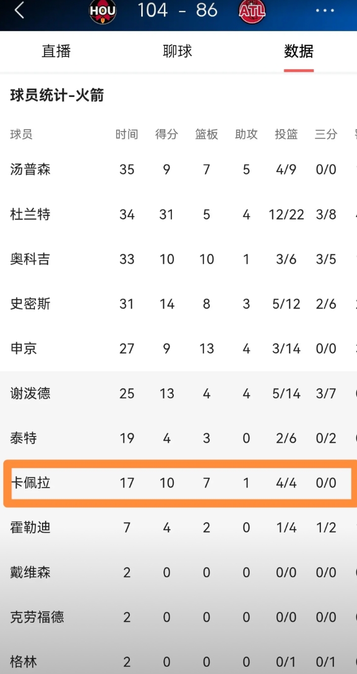 我必须要怒赞火箭中锋卡佩拉,他的表现真是太出彩了!在今天火箭客场以104:86战胜老鹰的比赛中,卡佩拉在攻防两端都打出了非常出彩的表现。