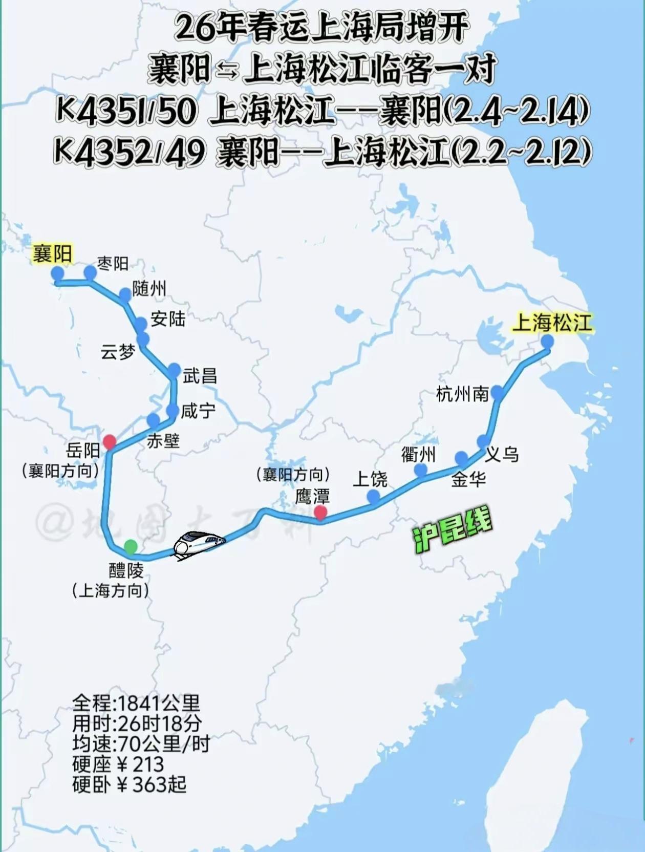 2026年1月26日全国铁路调图是铁路系统2026年第一季度的重要运力优化,既服务今年的春运高峰,也兼顾2026年一整年客货运能的提升。 调图后全国旅客列车达12130列(比调图前增加243列),货物列车23748列(增加177列),客货运输能力和效率同步升级,更好支撑“流动中国”和产业物流需求。 上海松江临时客车(K4351/52次) 这趟临时加开的客车是上海局针对2026年春运增开的重点线路,精准服务湖北籍务工人员返乡需求的。 1. 开行时间 ​ 襄阳→上海松江(K4352/49),2月2日-2月12日。 ​ 返程上海松江→襄阳(K4351/50),2月4日-2月14日。 完全覆盖春运节前返乡、节后返岗的高峰时段。 ​ 2. 线路与时效 全程1841公里,用时约26小时,硬座票价213元,硬卧363元起。 线路走沪昆线(上海松江→杭州南→义乌→金华→衢州→上饶→鹰潭),再转京广线/汉丹线(醴陵→岳阳→赤壁→咸宁→武昌→云梦→安陆→随州→枣阳→襄阳),虽绕经湖南但仅停少数站点,优先保障湖北沿线客流。 ​ 这趟车是典型的“务工返乡专列”,主要服务襄阳、枣阳、随州等湖北劳务输出大市的务工人员,缓解春运期间长三角与鄂北地区的运力缺口,让务工人员能更便捷、低成本地返乡过节。