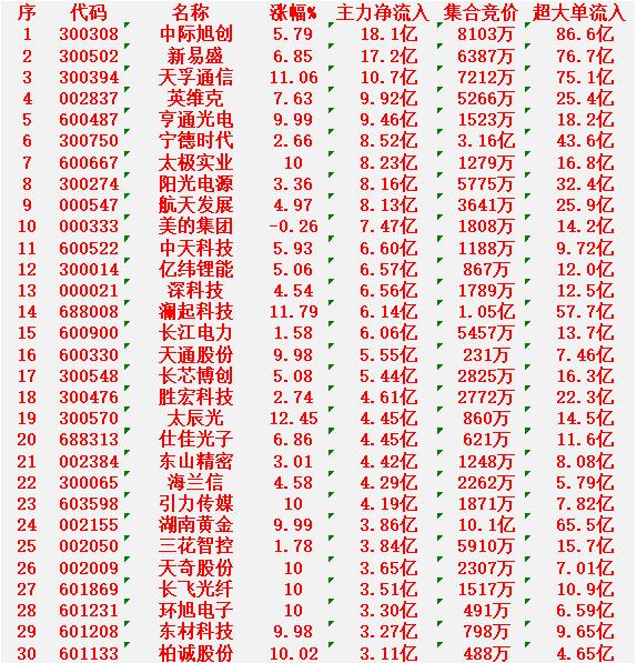 1月30日收盘,主力资金,已经大幅卖出了的30名单: 北方稀土:净流入 -15.9亿元 蓝色光标:净流入 -15.3亿元 洛阳钼业:净流入 -14.3亿元 浙文互联:净流入 -13.3亿元 江波龙:净流入 -13.2亿元 铜陵有色:净流入 -13.0亿元 紫金矿业:净流入 -10.7亿元 赣锋锂业:净流入 -9.78亿元 华友钴业:净流入 -9.71亿元 天齐锂业:净流入 -9.57亿元 1月30日收盘,主力资金“大幅买入”的30名单: 中际旭创:净流入 18.1亿元 新易盛:净流入 17.2亿元 天孚通信:净流入 10.7亿元 英维克:净流入 9.92亿元 亨通光电:净流入 9.46亿元 宁德时代:净流入 8.52亿元 太极实业:净流入 8.23亿元 阳光电源:净流入 8.16亿元 航天发展:净流入 8.13亿元 美的集团:净流入 7.47亿元 中天科技:净流入 6.60亿元 亿纬锂能:净流入 6.57亿元 深科技:净流入 6.56亿元 澜起科技:净流入 6.14亿元 长江电力:净流入 6.06亿元 天通股份:净流入 5.55亿元 长芯博创:净流入 5.44亿元 胜宏科技:净流入 4.61亿元 太辰光:净流入 4.45亿元 仕佳光子:净流入 4.45亿元