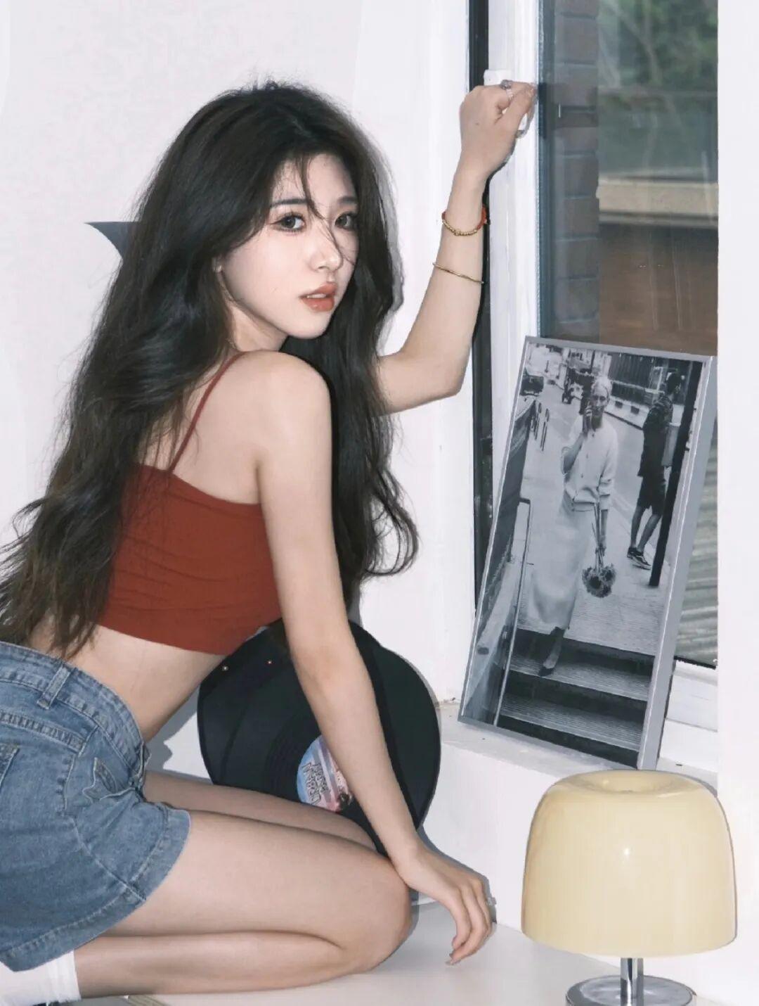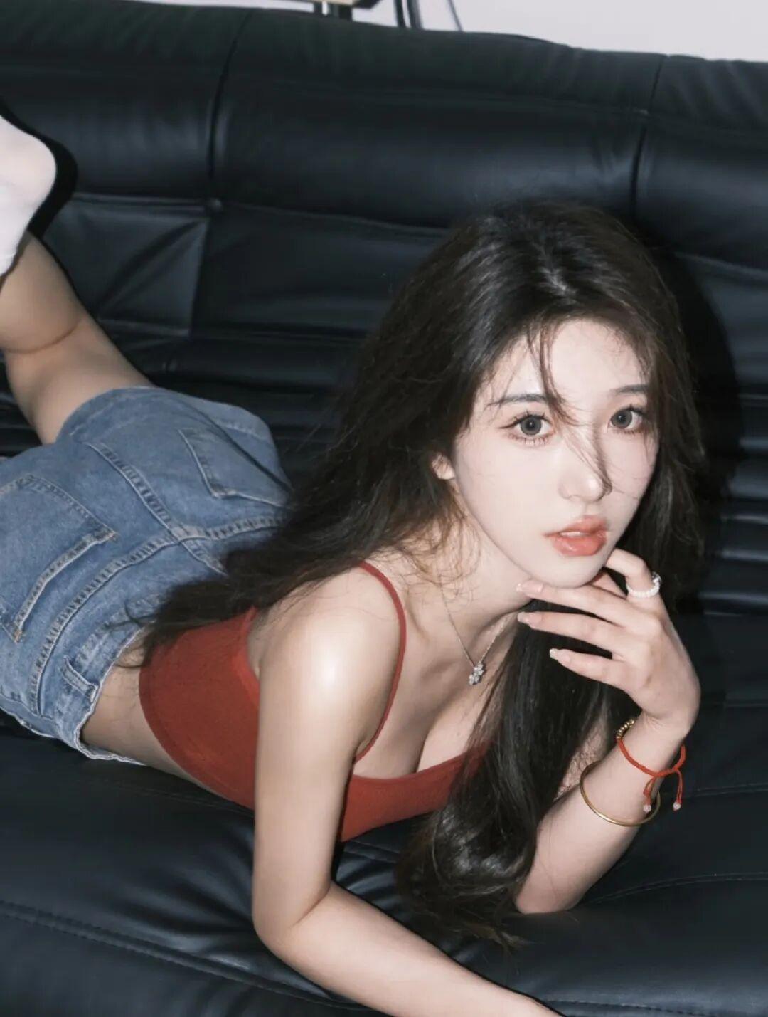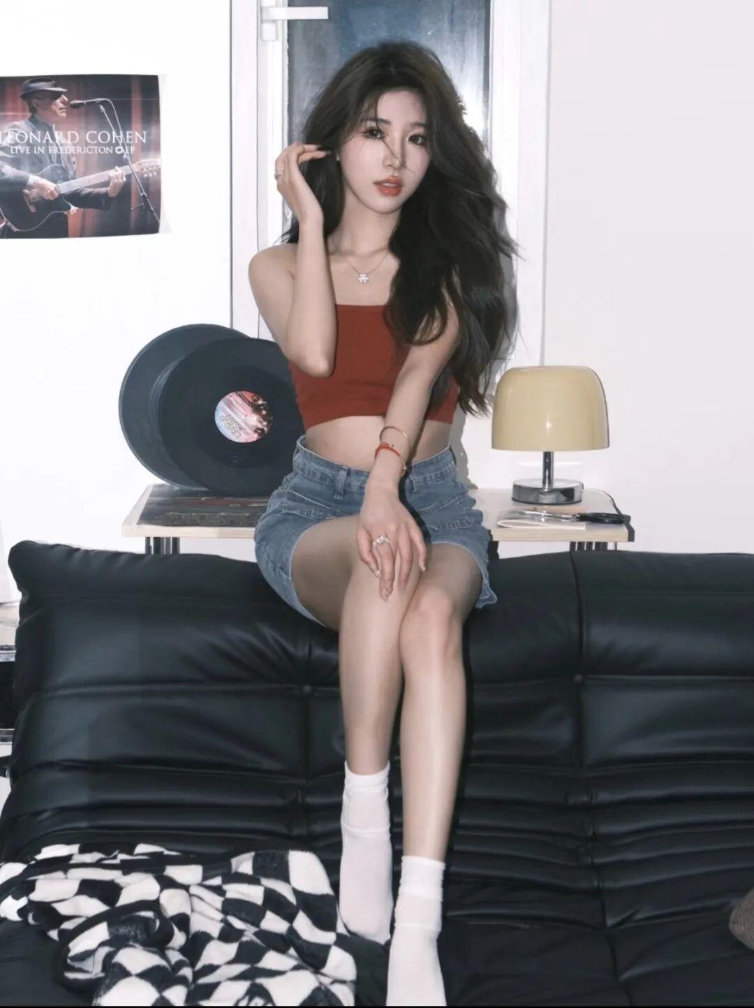 复古黑胶唱片旁,少女慵懒倚靠沙发,时尚穿搭尽显魅力。
