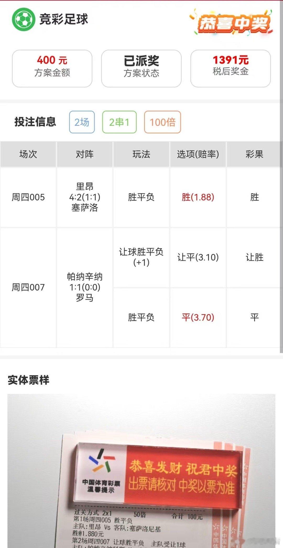 恭喜这位幸运的老铁,二串一稳稳落袋 !中奖这种事,信则灵,跟则红。